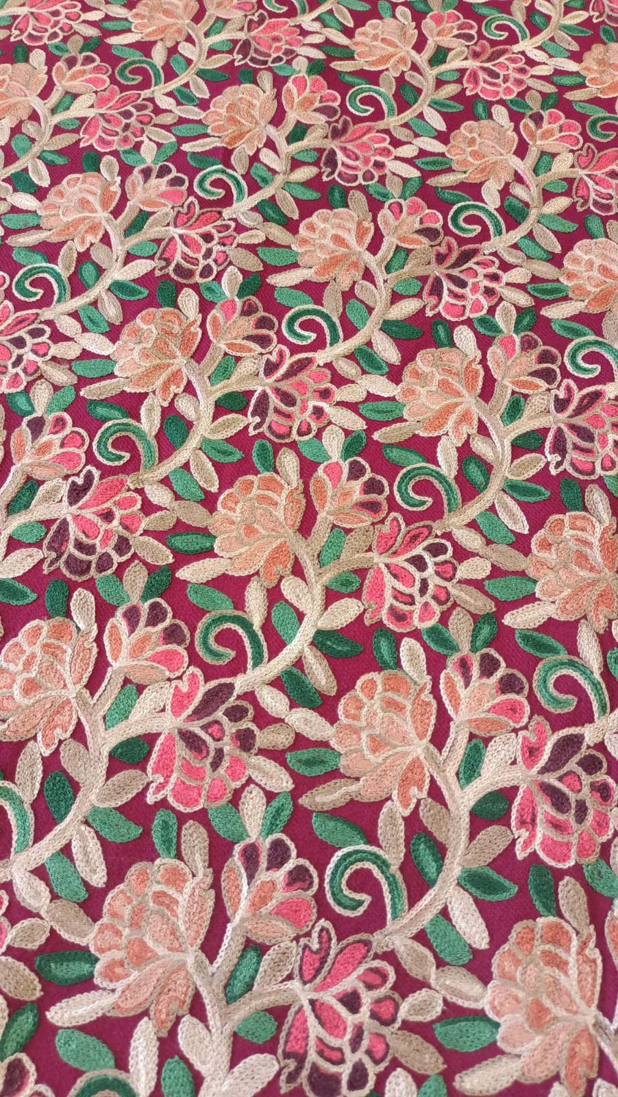 Wrap yourself in timeless elegance with this exquisite Aari embroidered pashmina shawl. Handcrafted by skilled artisans, this shawl features intricate floral and paisley motifs meticulously stitched onto a sumptuously soft pashmina base. The rich, earthy tones of the embroidery beautifully complement the deep maroon hue of the shawl, creating a piece that is both luxurious and versatile.