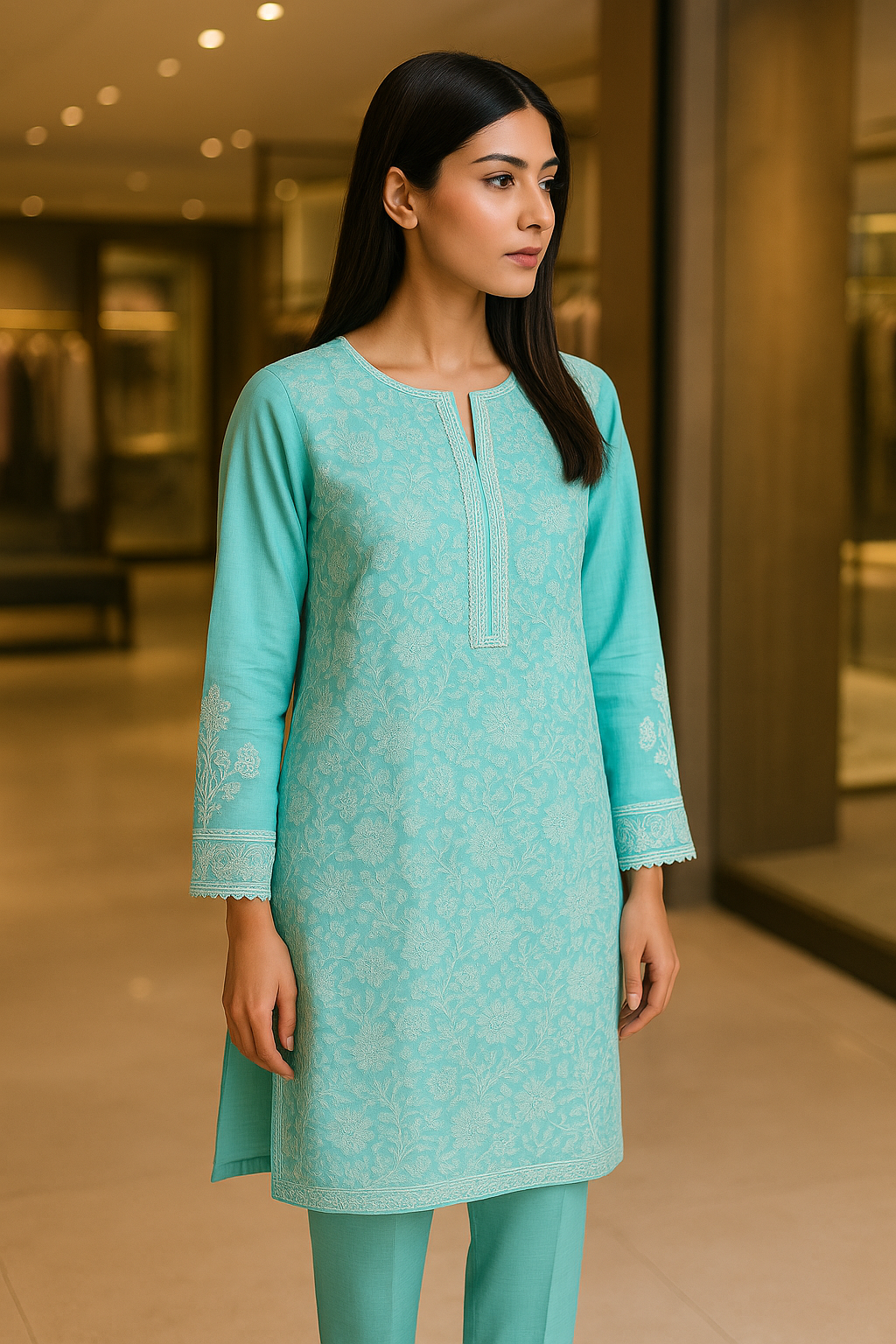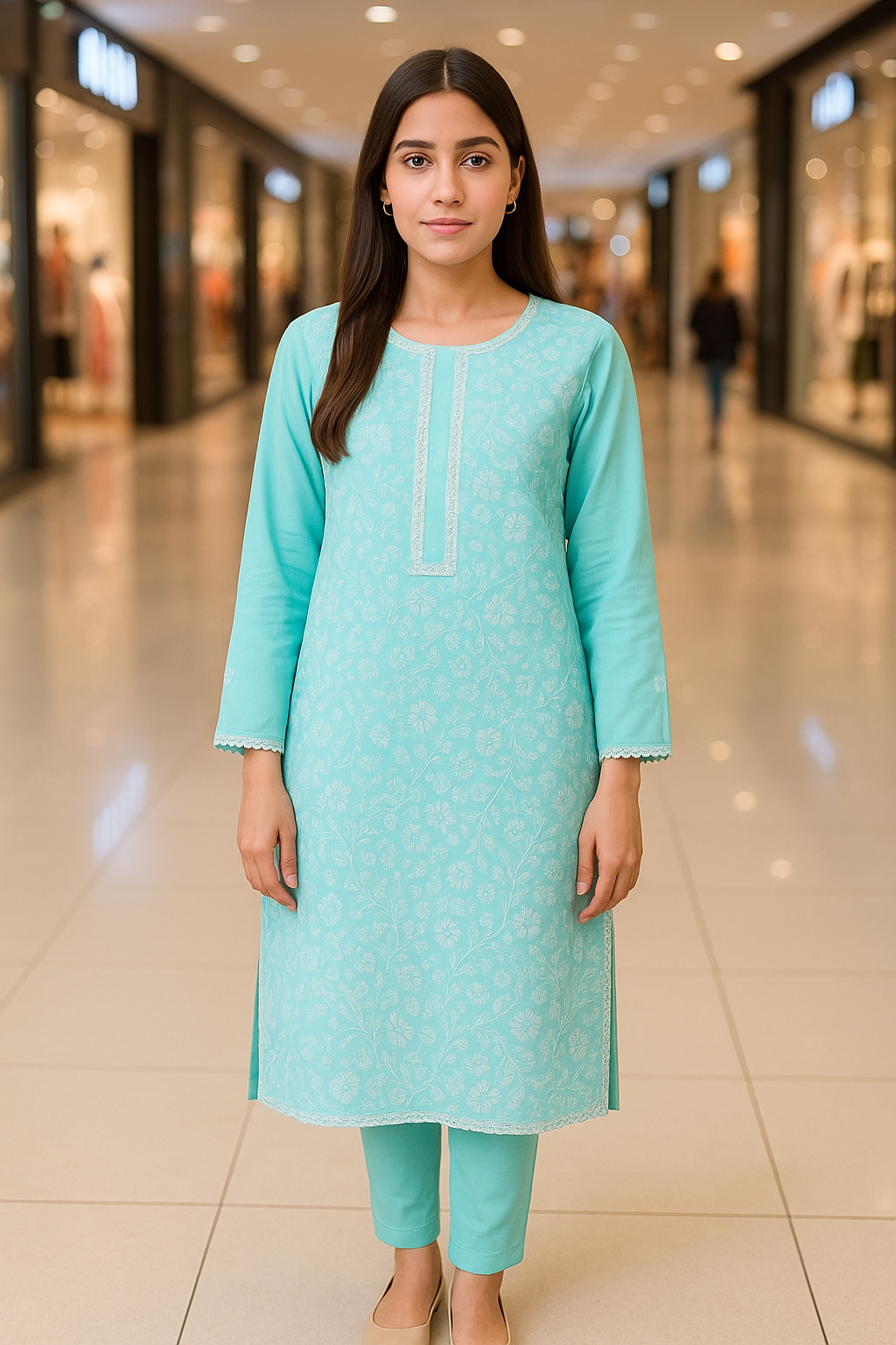 Elevate your summer wardrobe with this elegant 2-piece stitched lawn suit by Bareeze, crafted in a refreshing aqua blue shade. Made from premium quality lawn, the kurta features delicate tone-on-tone floral embroidery that adds timeless charm and refinement to your everyday style.