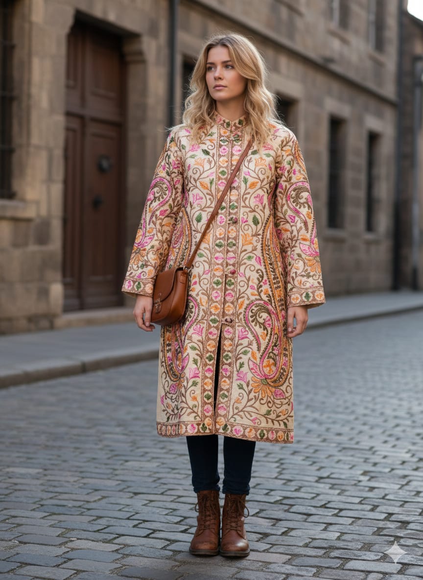 Elevate your wardrobe with a piece of timeless artistry. This stunning jacket is a testament to the exquisite and intricate embroidery traditions of Kashmir. Perfect for adding a touch of bohemian elegance and vibrant color to any outfit.