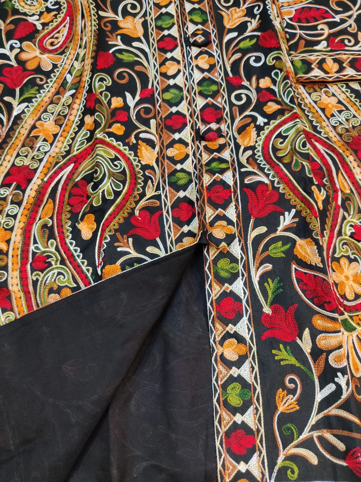 Artisan-Crafted Kashmiri Aari Embroidered Jacket - black Floral Statement Coat