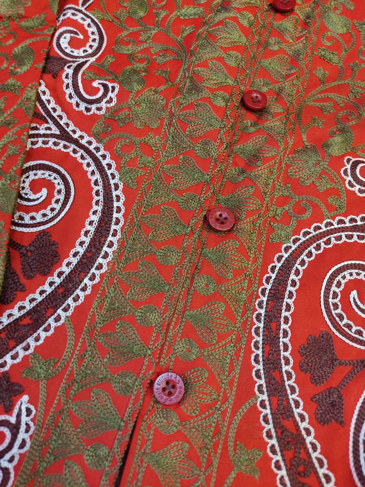 Elevate your wardrobe with a piece of timeless artistry. This stunning jacket is a testament to the exquisite and intricate embroidery traditions of Kashmir. Perfect for adding a touch of bohemian elegance and vibrant color to any outfit.