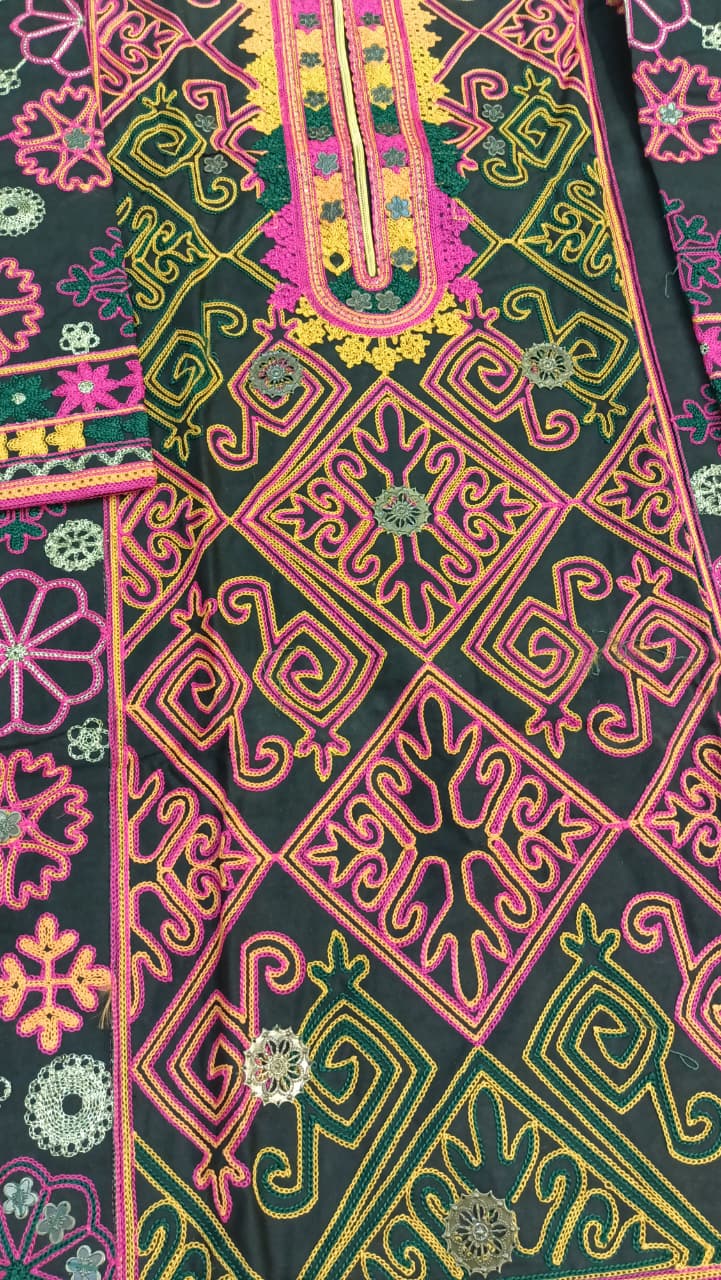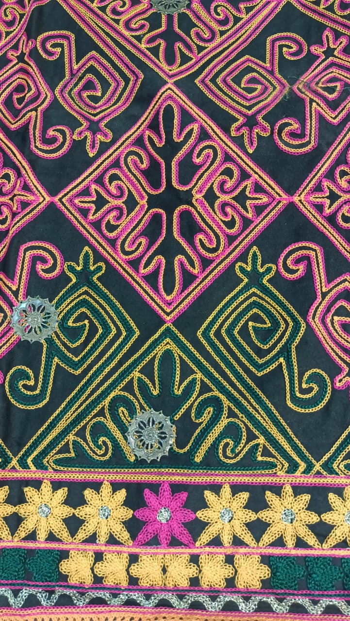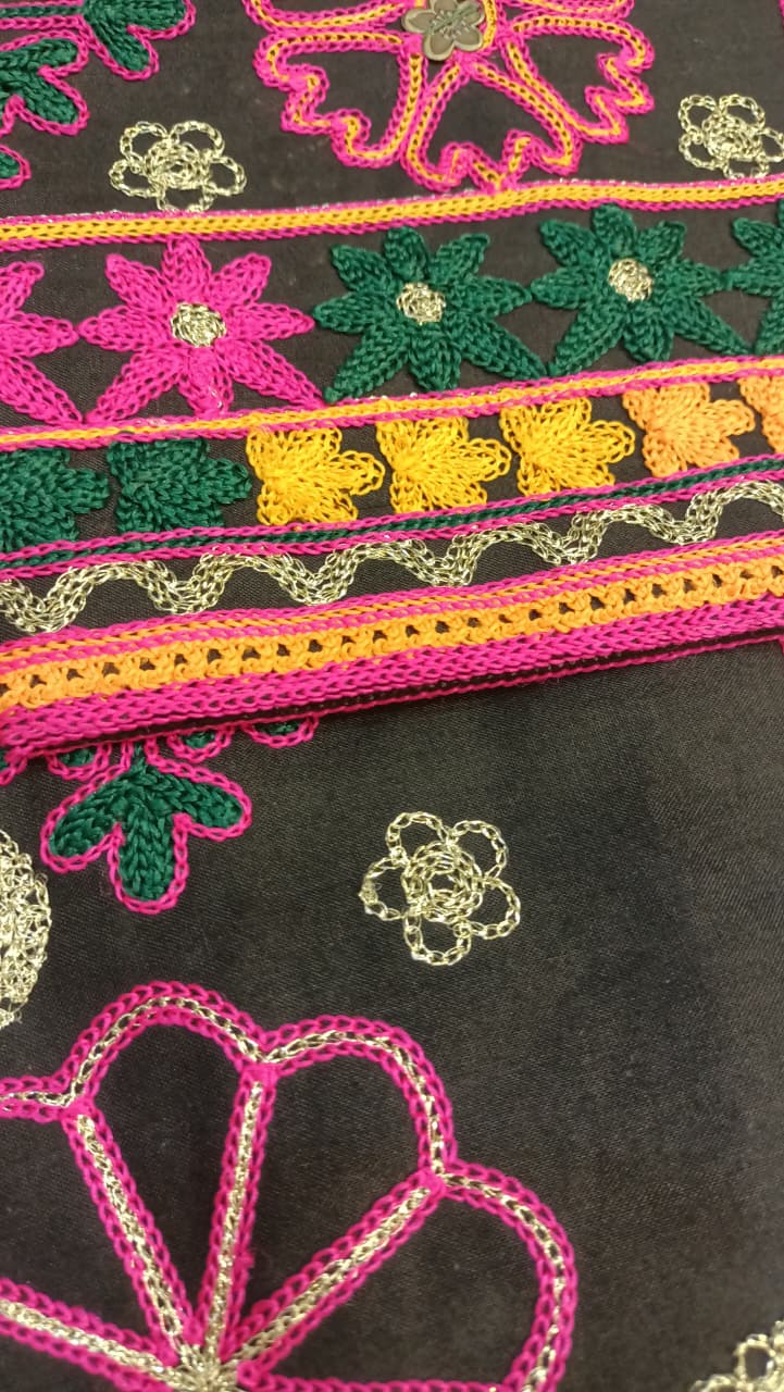 Design: Intricately detailed traditional ethnic embroidery in striking shades of Pink, Magenta, Yellow, and Green against a classic Black base.