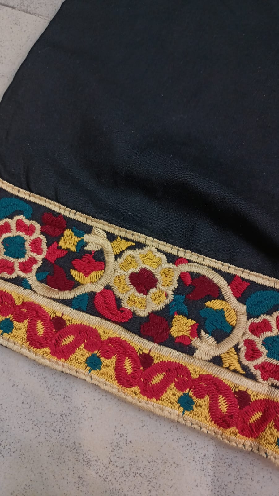 Design: Intricately detailed traditional ethnic embroidery in striking shades of Pink, Magenta, Yellow, and Green against a classic Black base.