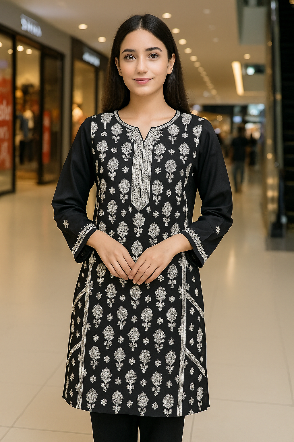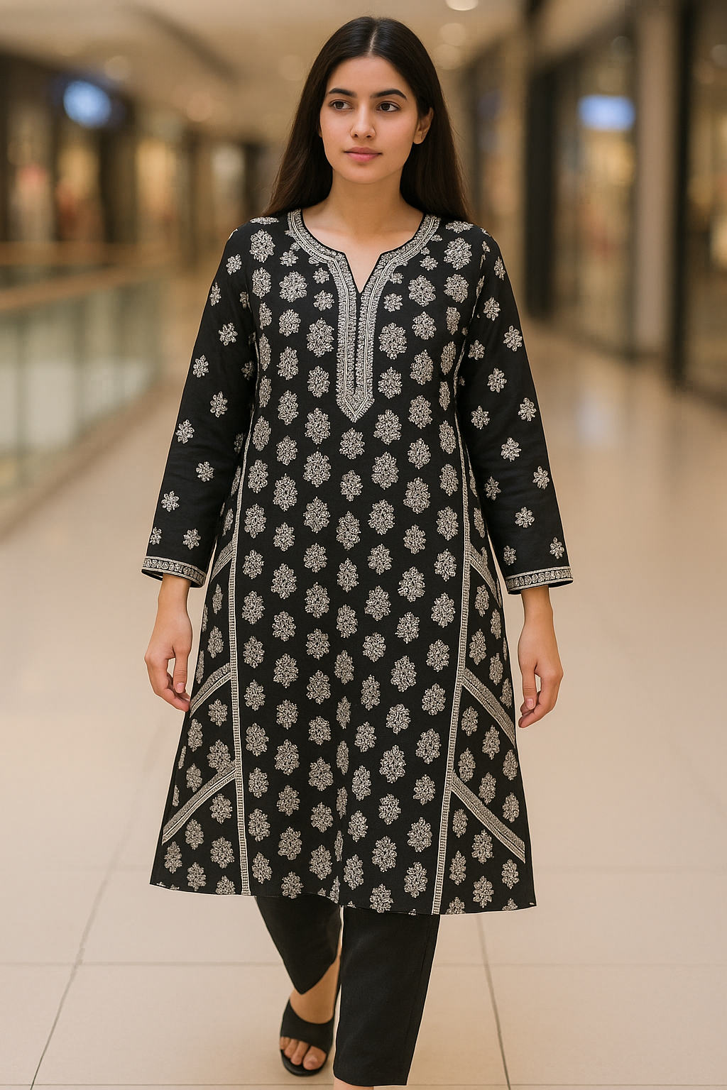 Elevate your everyday style with this stunning black and white 2-piece lawn suit, crafted to perfection for timeless grace and effortless comfort. This stitched ensemble includes a beautifully embroidered kurta paired with matching straight pants, making it ideal for casual outings, semi-formal gatherings, and festive get-togethers.