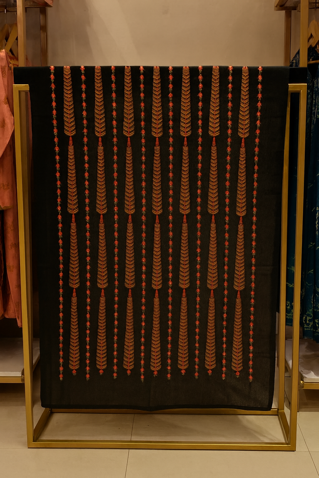 Black Karandi Embroidered Shawl Rust & Red Vertical Motif Design