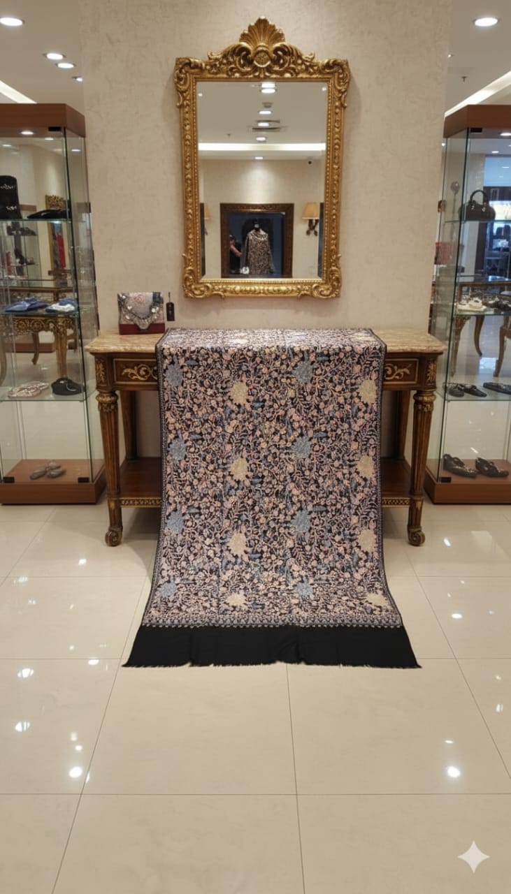 Elevate your winter style with this luxurious black pashmina shawl, adorned with exquisite multicolour floral aari embroidery in earthy beige and muted teal tones. Crafted from soft, premium pashmina fabric, it offers unmatched warmth and elegance. The intricate vine and blossom patterns flow gracefully across the shawl, framed with a detailed embroidered border for a refined finish. Perfect for pairing with both formal and casual outfits, this statement piece is a timeless addition to your wardrobe.