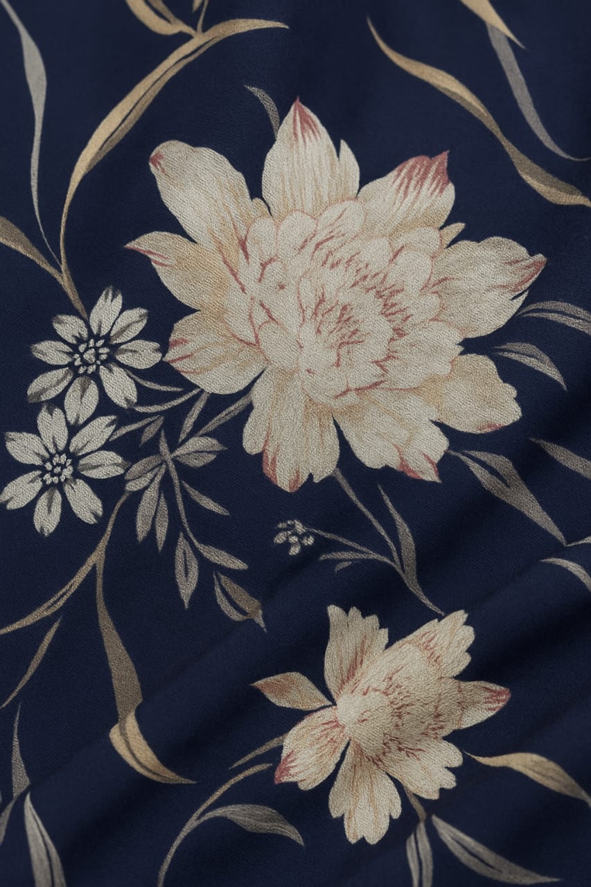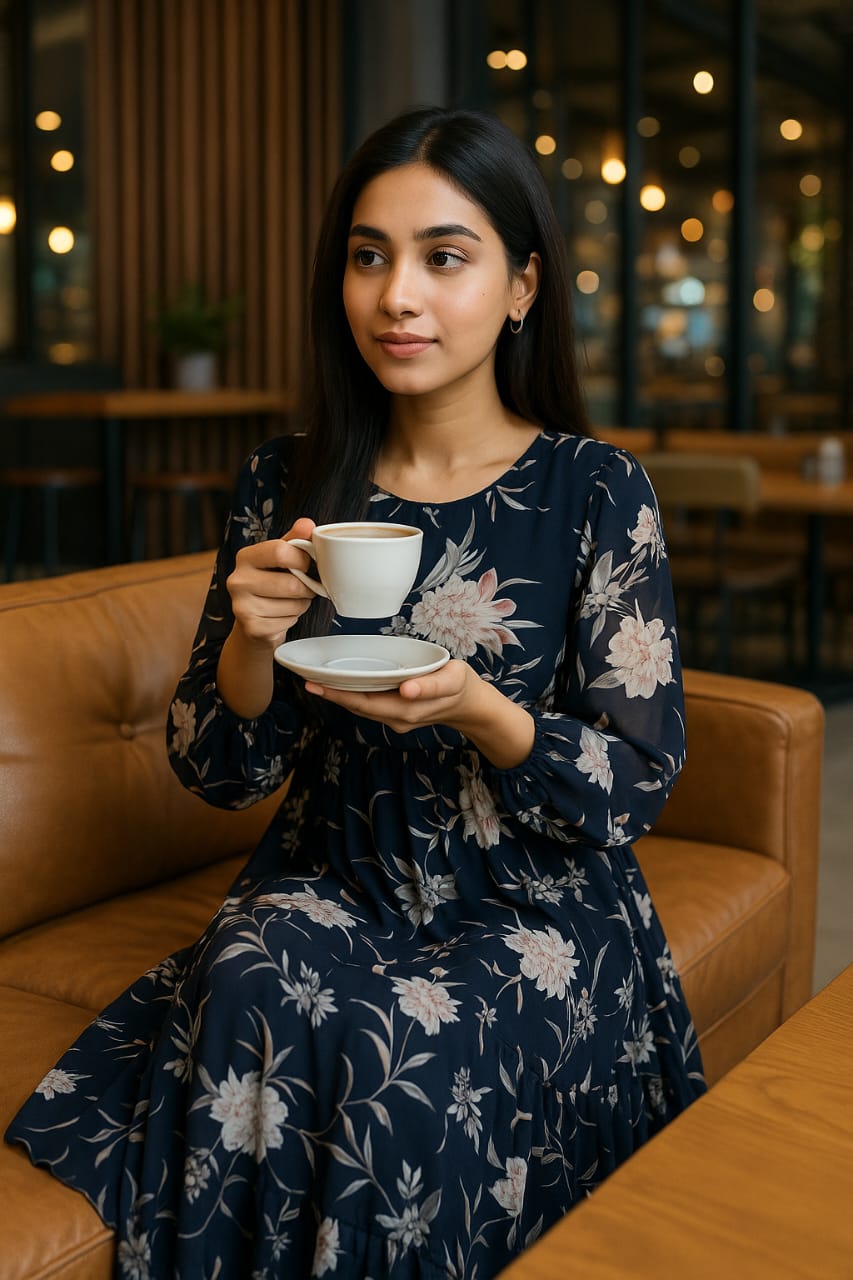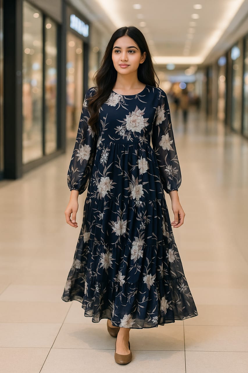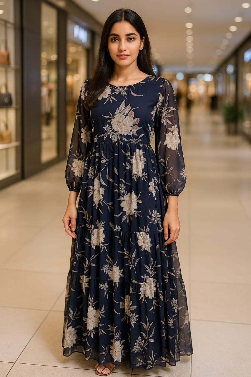 "Elegance in full Bloom .Pakistani young stylish model gracefully flaunts this navy floral chiffon long maxi. Perfect for a breezy day out at the mall, the soft flowy silhouette and sheer sleeves add a touch of effortless charm."