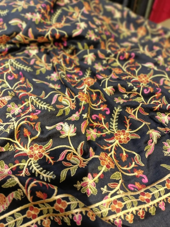 Wrap yourself in timeless luxury with this handcrafted blue pashmina shawl, featuring exquisite multicolor floral embroidery across its surface. The deep navy base sets the perfect canvas for the vibrant threadwork, while the delicate four-side embroidered border enhances its artisanal charm.