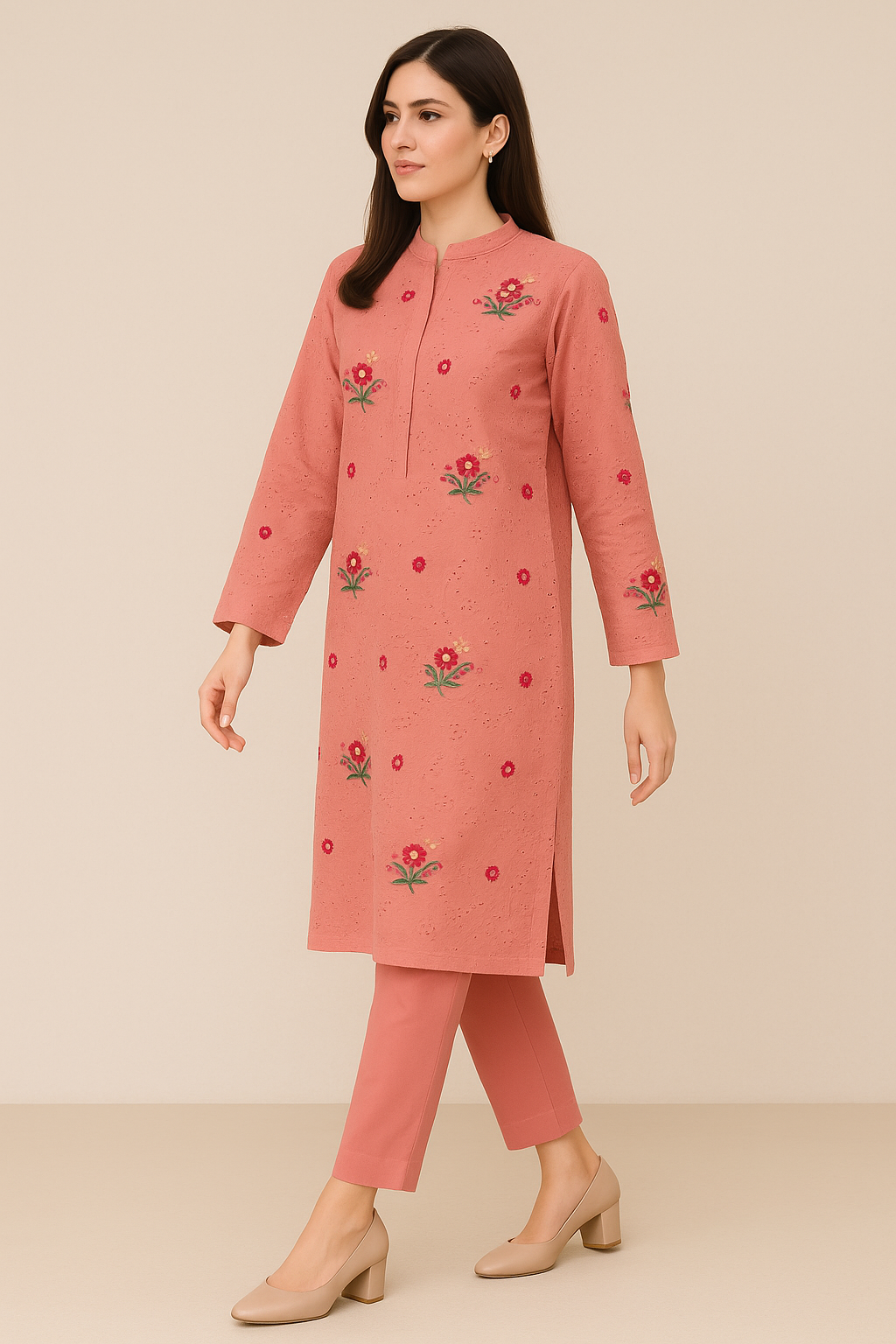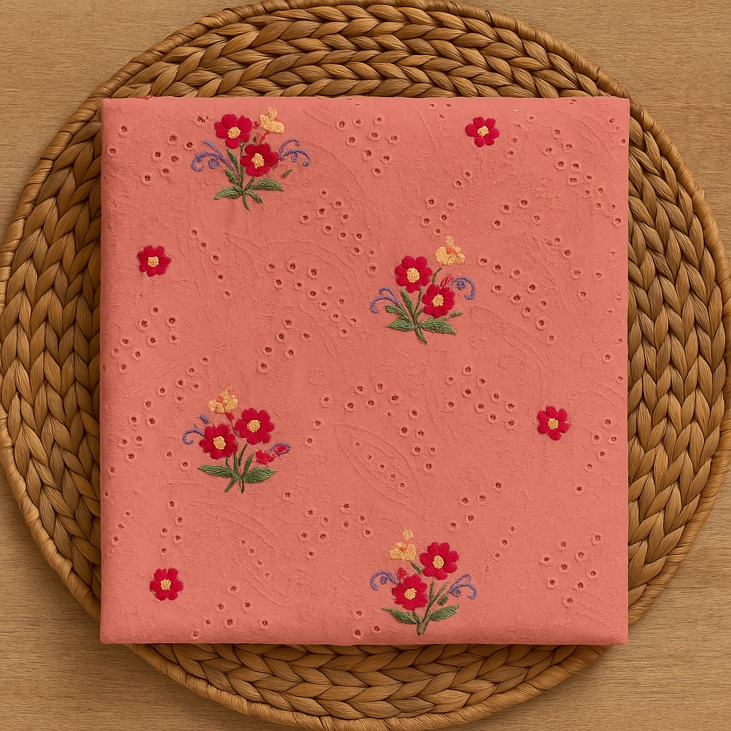 Elevate your summer wardrobe with this stunning unstitched lawn chikankari embroidered fabric, designed to bring elegance and charm to every occasion. Crafted on a soft dusty rose lawn base, the fabric features delicate chikankari cutwork paired with vibrant floral embroidery in shades of red, yellow, and violet — creating a graceful balance of tradition and contemporary style.