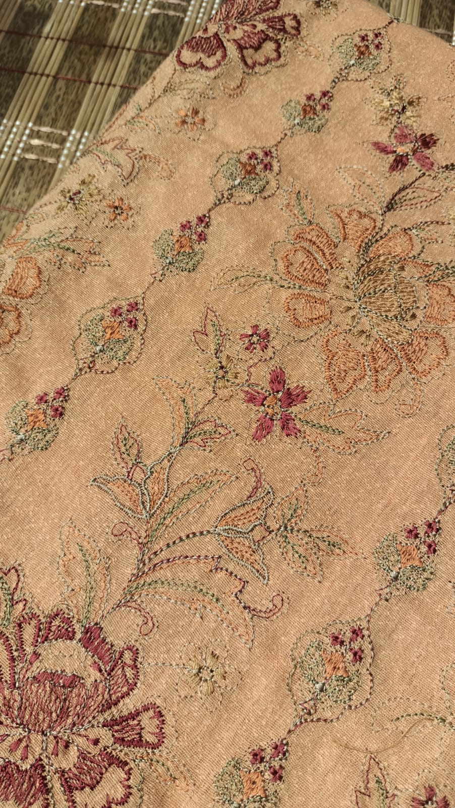 Effortlessly chic and timelessly elegant, this ensemble is perfect for making a sophisticated statement. Our exquisite karandi shawl, adorned with intricate, tonal embroidery, drapes beautifully over a simple and classic plain suit. The warm, earthy hue of the fabric creates a look that is both refined and versatile. Pair it with matching high heels, just like our model, for a complete and polished look perfect for any special occasion or formal gathering.