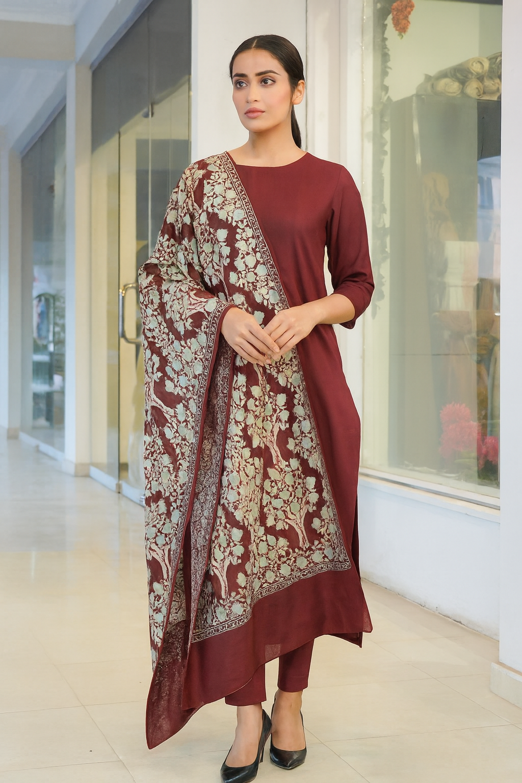 Wrap yourself in timeless luxury with our exquisitely embroidered pashmina shawl, featuring a detailed tree motif in subtle beige on a rich maroon base. Crafted from high-quality pashmina, this full-length shawl (2.5 meters) offers both warmth and grace, making it a versatile statement piece for any season.