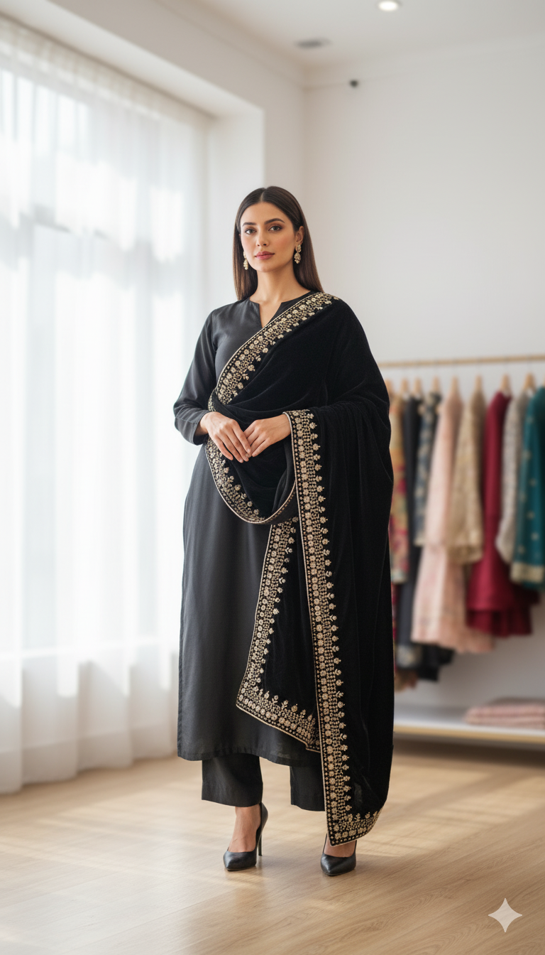 Wrap yourself in timeless elegance with our Hand-Embroidered Velvet Shawl, a masterpiece of craftsmanship and luxury. Crafted from the finest black velvet, this shawl is adorned with intricate hand embroidery in regal gold thread, creating a border that exudes sophistication and grandeur.