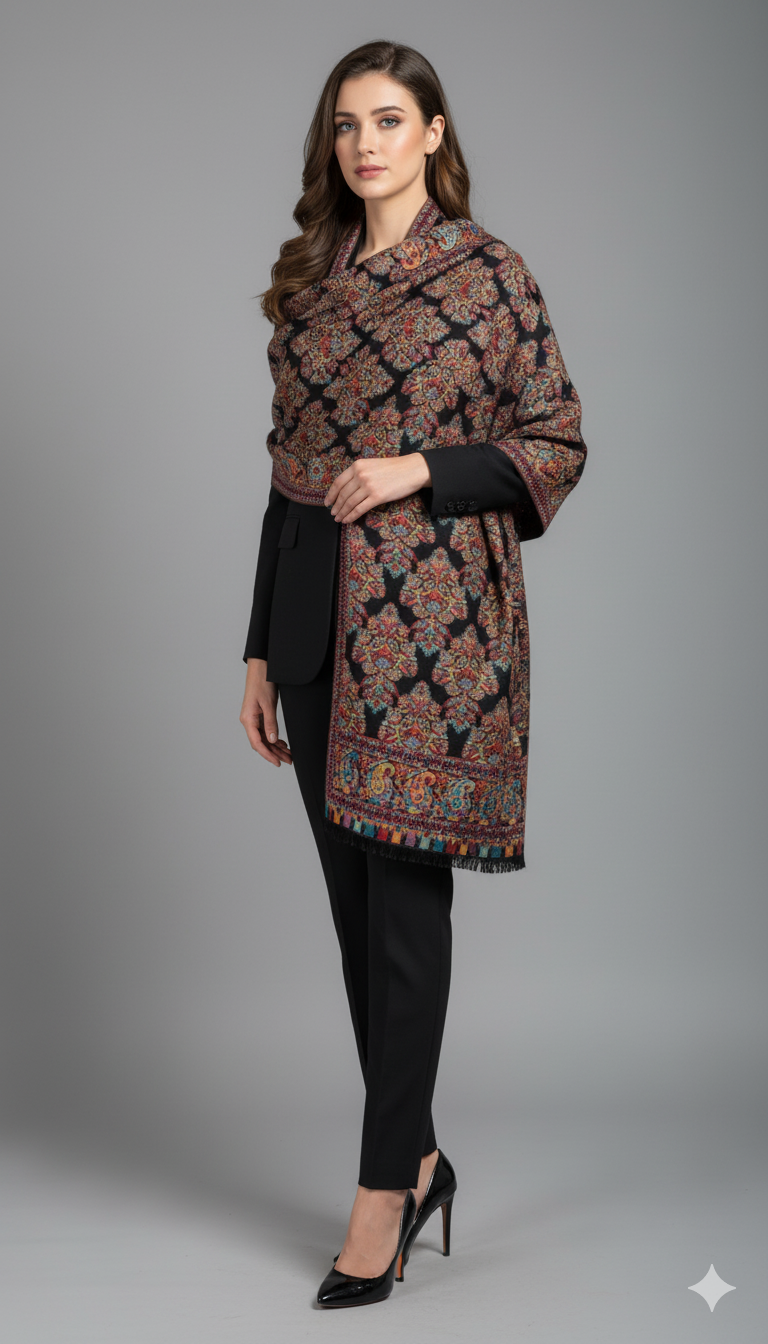 Lightweight yet warm, it drapes effortlessly over shoulders, whether styled with formal wear, casual outfits, or evening attire. Its compact size makes it the perfect accessory for adding a statement of sophistication without the bulk of a full shawl. Finished with a finely woven border, it reflects meticulous craftsmanship and artisanal finesse.