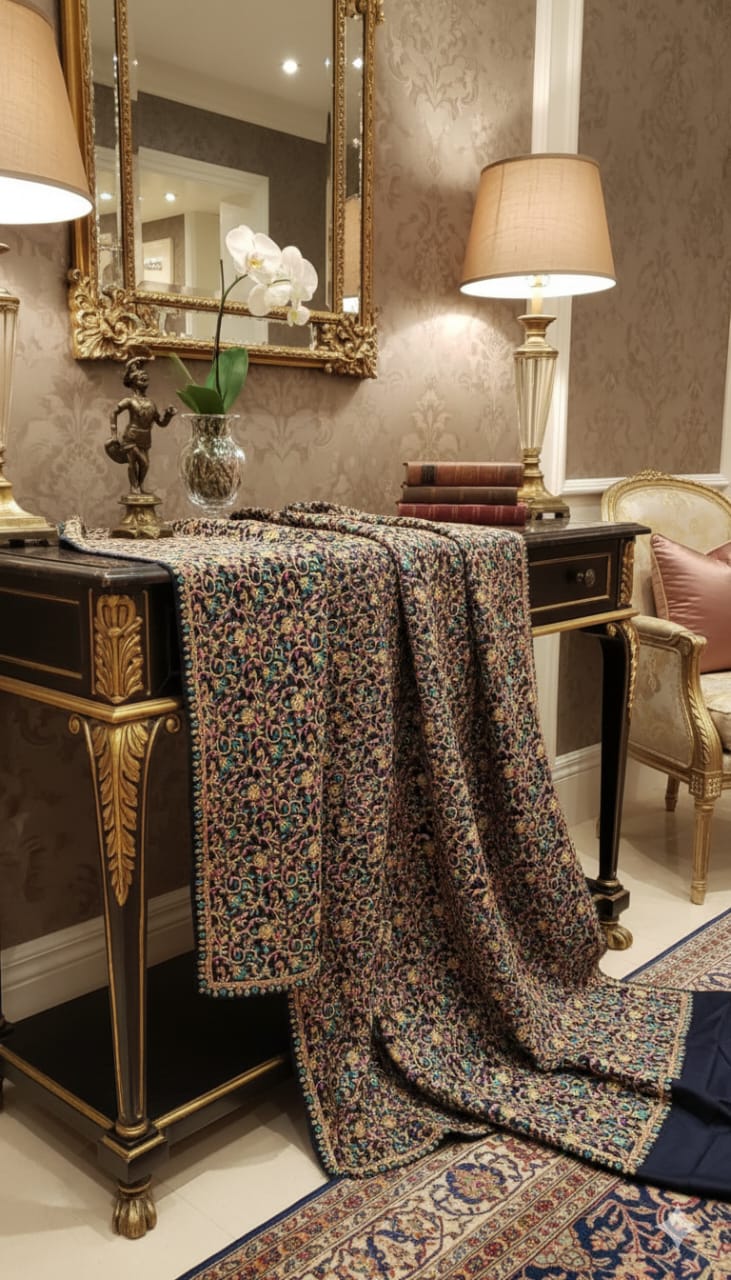 Wrap yourself in timeless elegance with our Kashmiri Aari Embroidered Wool Shawl. Crafted on a rich navy base, this luxurious piece features intricate hand-style Aari embroidery in warm gold, teal, and subtle crimson floral motifs, creating a garden-like pattern across the fabric. The soft wool keeps you warm while maintaining a lightweight drape, perfect for both casual and formal wear. Finished with a detailed border that frames the design beautifully, this shawl is a true heritage statement for your winter wardrobe.