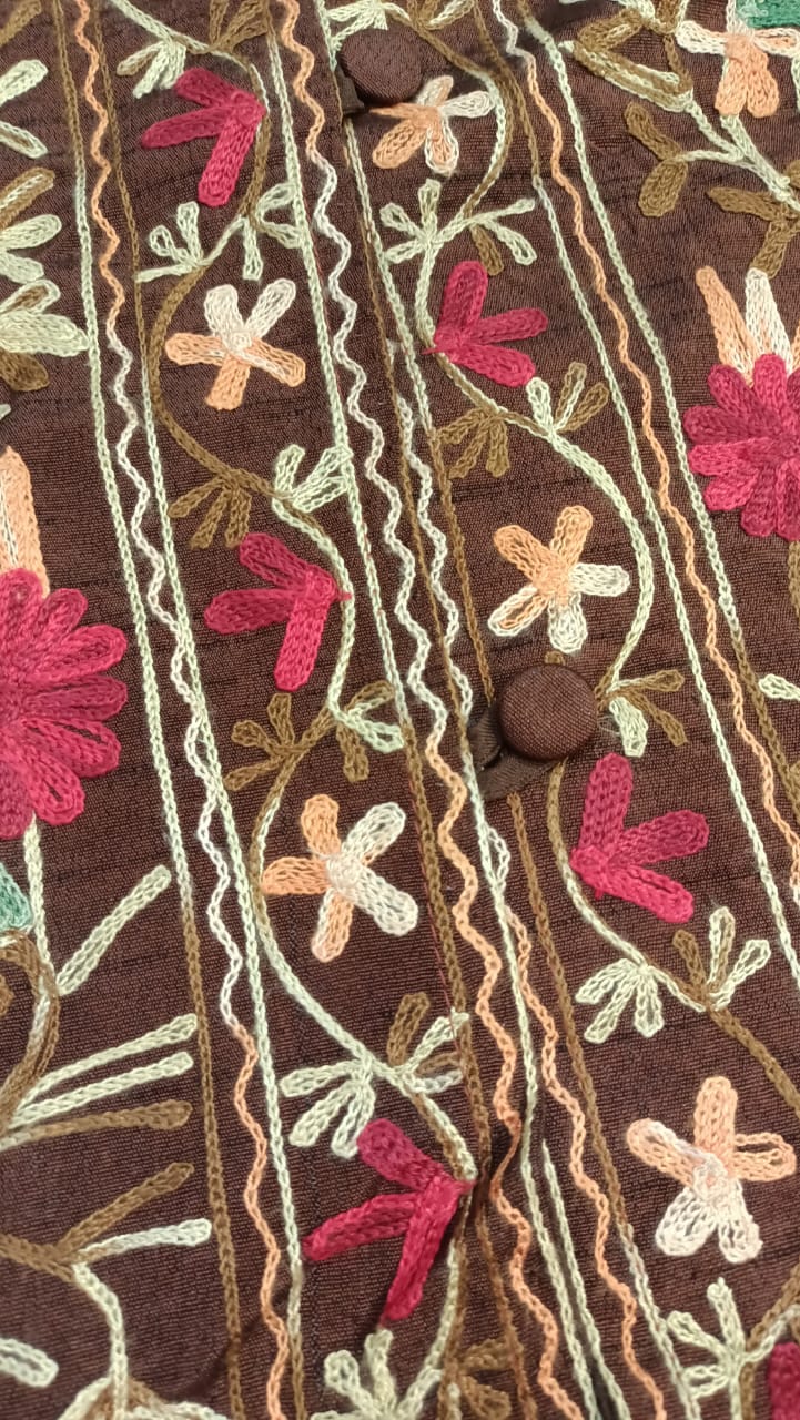 Elevate your wardrobe with this exquisite, one-of-a-kind long jacket, featuring the celebrated Kashmiri Aari embroidery. Crafted from a luxurious brown silk, this coat showcases a rich tapestry of floral and vine patterns in vibrant shades of red, green, and gold, making it a true statement piece for any season.