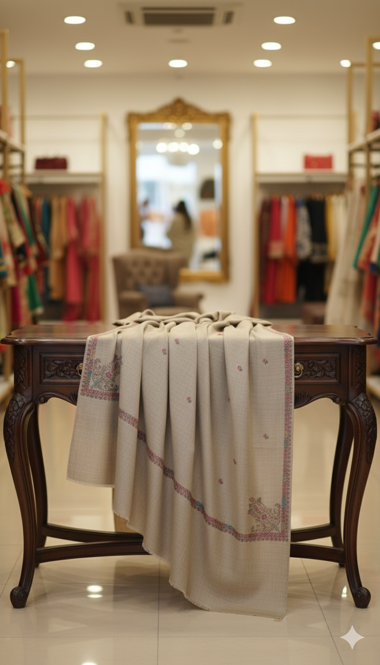 Wrap yourself in timeless elegance with this exquisite Pashmina Shawl. Crafted from the finest wool, it features a soft beige base adorned with subtle embroidered motifs and a delicate floral border in shades of pink and teal. Lightweight yet luxuriously warm, this shawl is perfect for both formal gatherings and everyday sophistication.