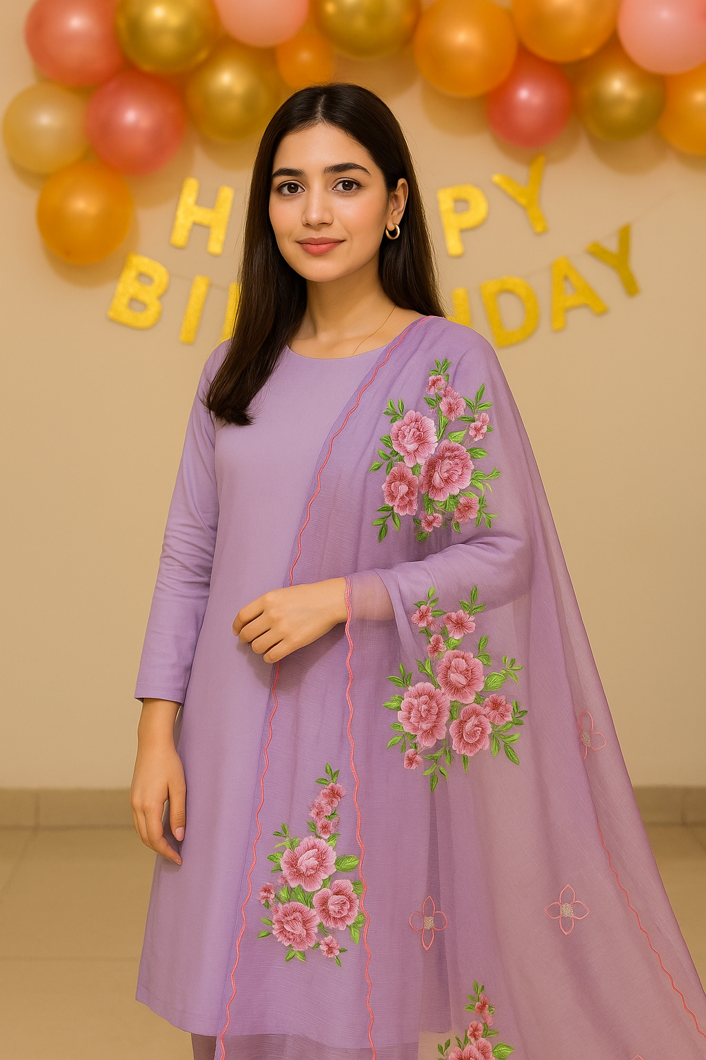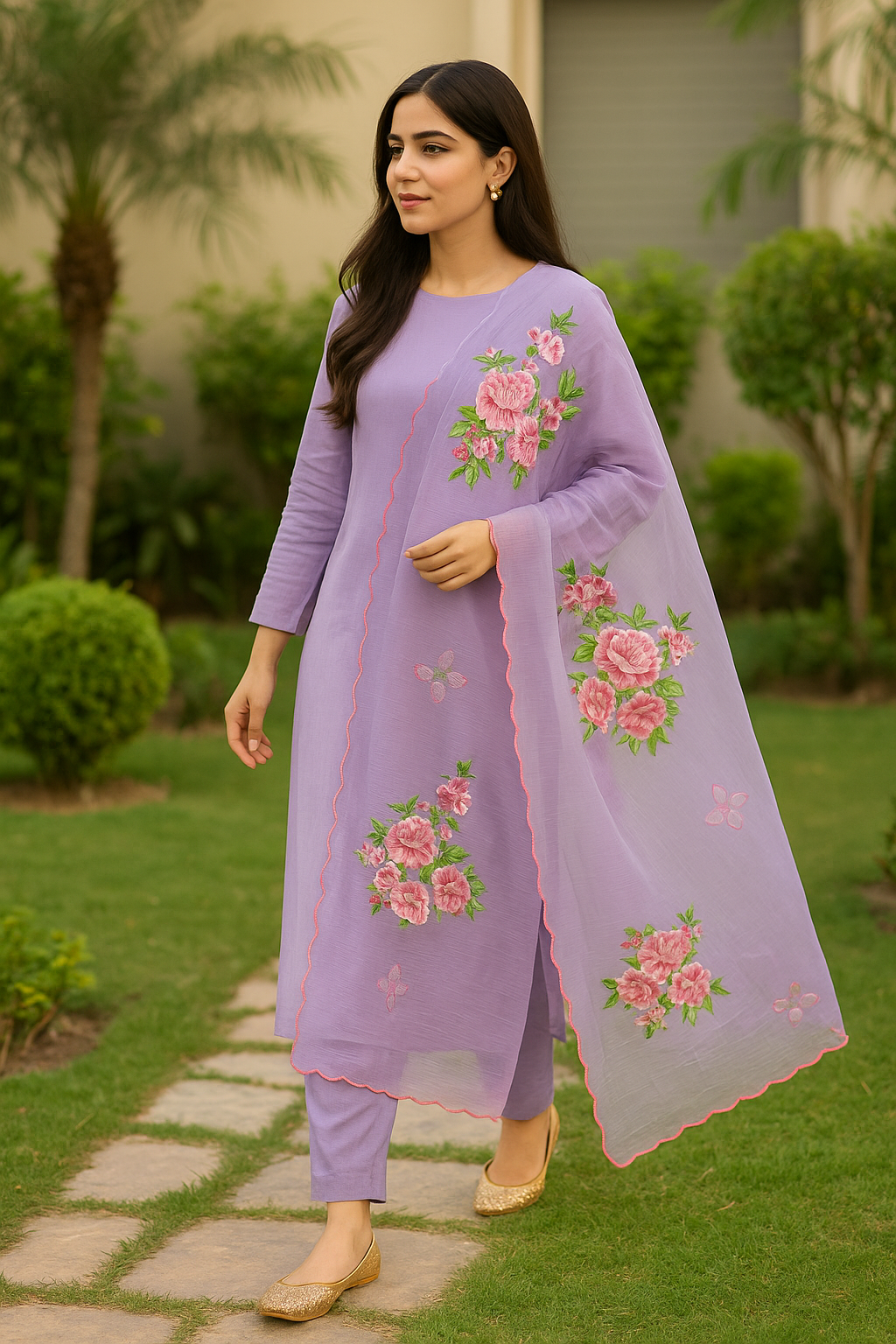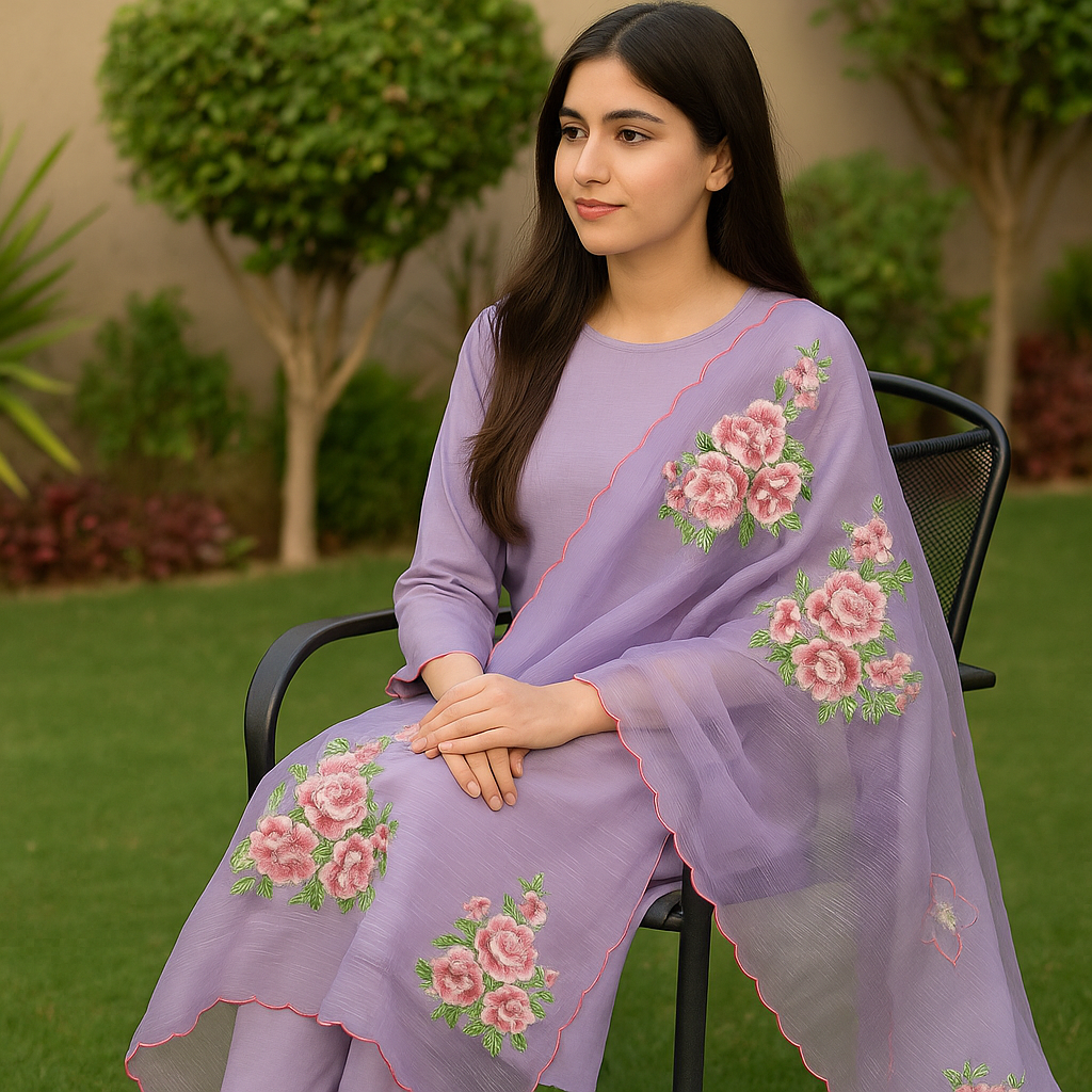 Delicately crafted on soft cotton net, this lavender dupatta features intricate machine embroidery with shaded pink floral motifs and scalloped edges. An elegant blend of tradition and modern finesse.