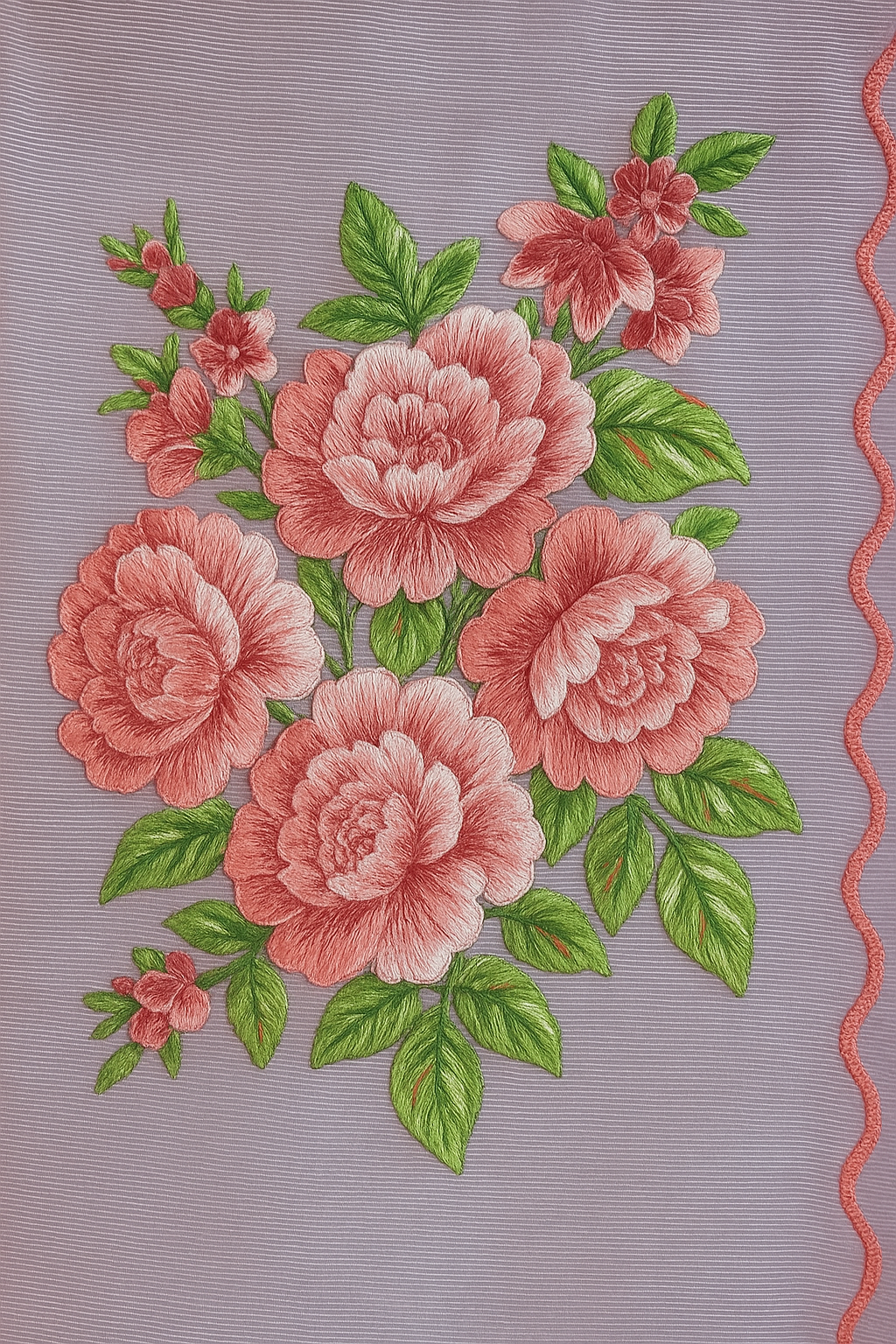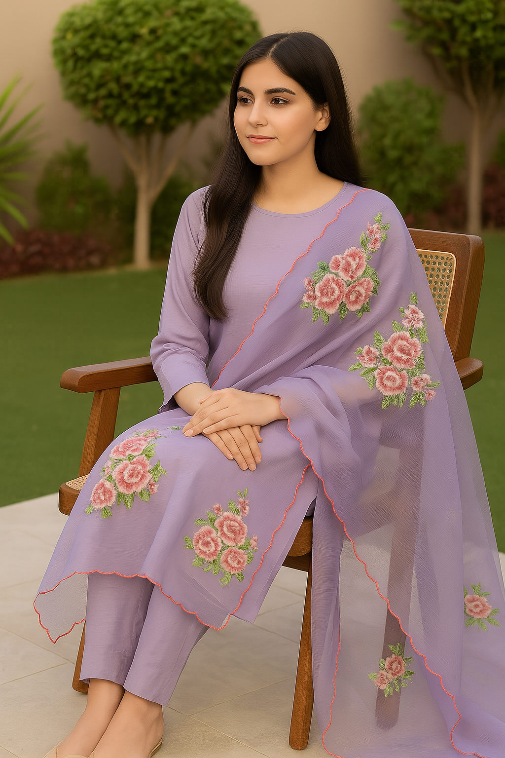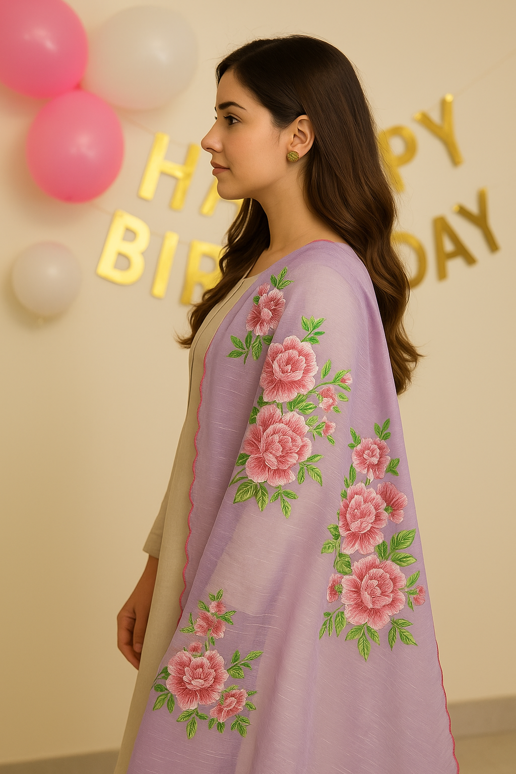 Delicately crafted on soft cotton net, this lavender dupatta features intricate machine embroidery with shaded pink floral motifs and scalloped edges. An elegant blend of tradition and modern finesse.