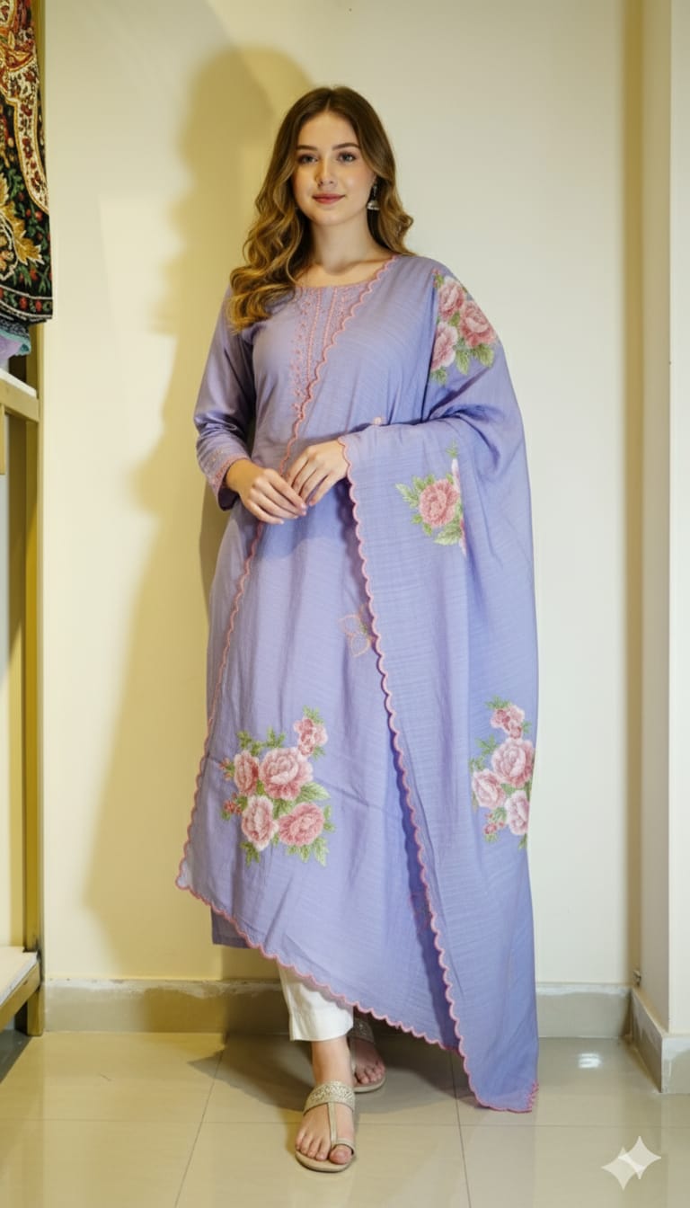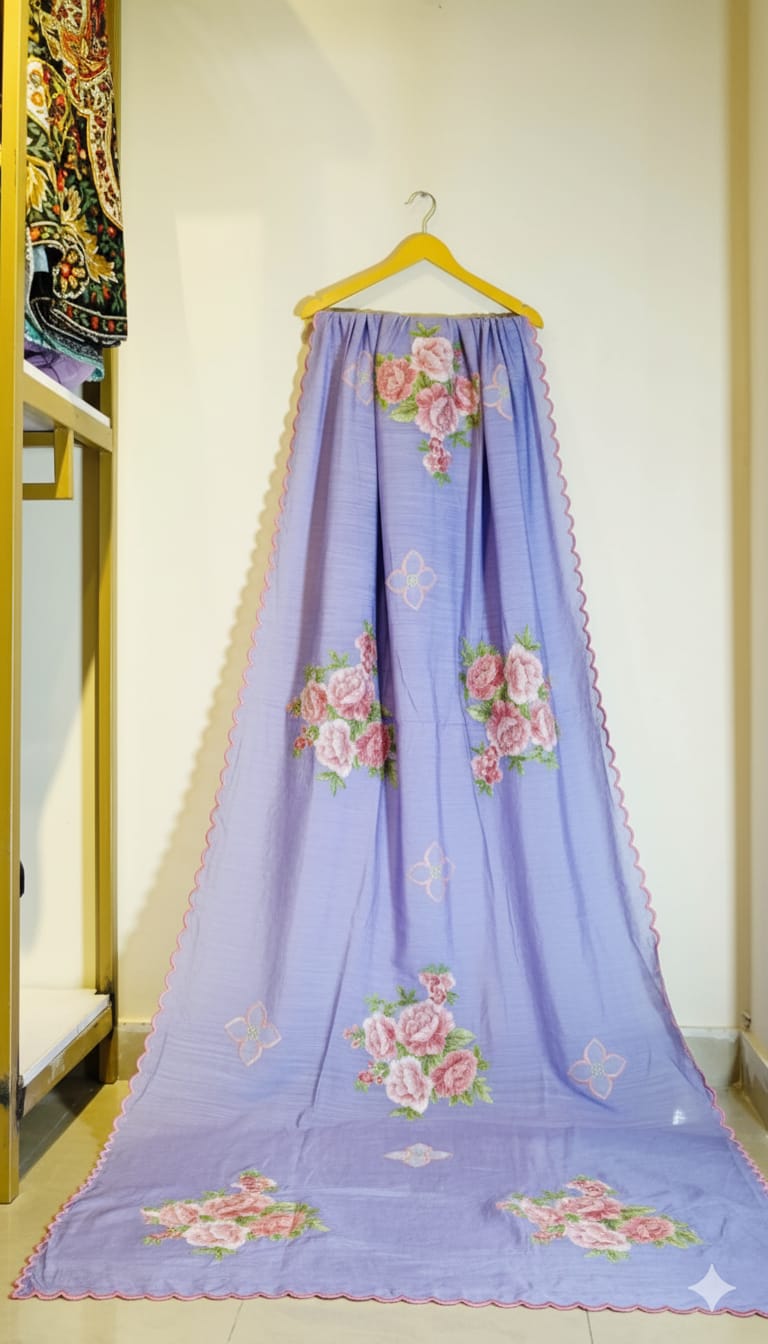 A graceful lavender cotton net dupatta adorned with intricate floral machine embroidery in soft pink hues, beautifully accented with green leaves and scalloped edges perfect for adding elegance to any festive or formal ensemble.