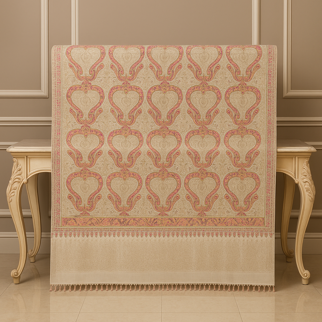 Elevate your wardrobe with this luxurious embroidered pashmina shawl, crafted with intricate paisley motifs in vibrant shades of pink, orange, and gold. The detailed handwork is beautifully highlighted on a soft cream base, making it a statement accessory for both casual and formal occasions.