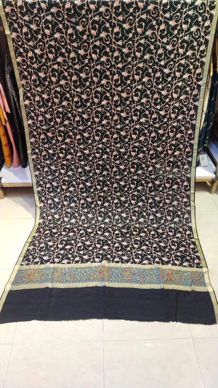Wrap yourself in timeless elegance with this exquisite black pashmina shawl, adorned with delicate multicolor floral embroidery in a classic vine pattern. The design is framed with a sophisticated olive-gold border and an intricately woven paisley panel in rich teal, rust, and gold tones, adding a regal touch.