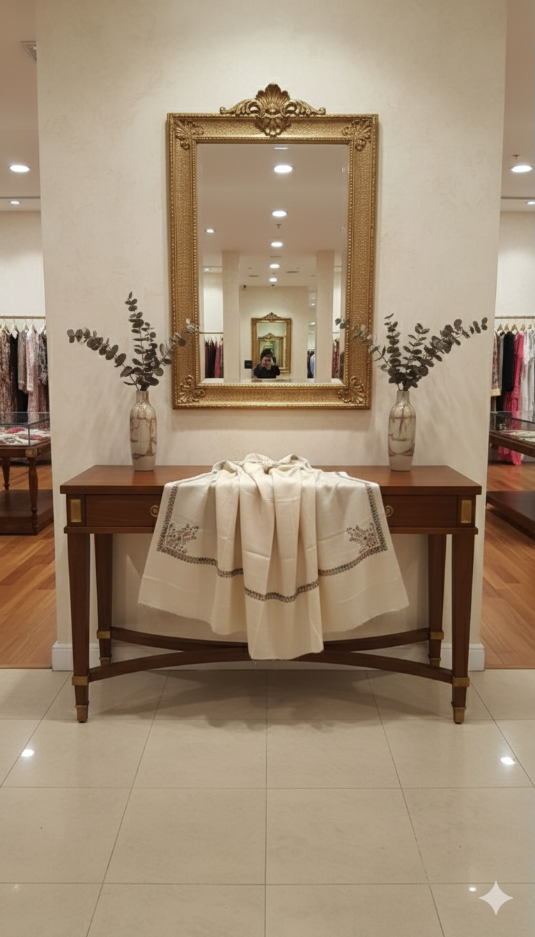 The shawl features a delicate embroidered border with intricate floral motifs that add a refined charm without overwhelming the simplicity of its ivory base. Its versatile design makes it the perfect companion for both formal occasions and everyday grace. Whether paired with an evening outfit or layered over a casual ensemble, this piece radiates understated luxury.