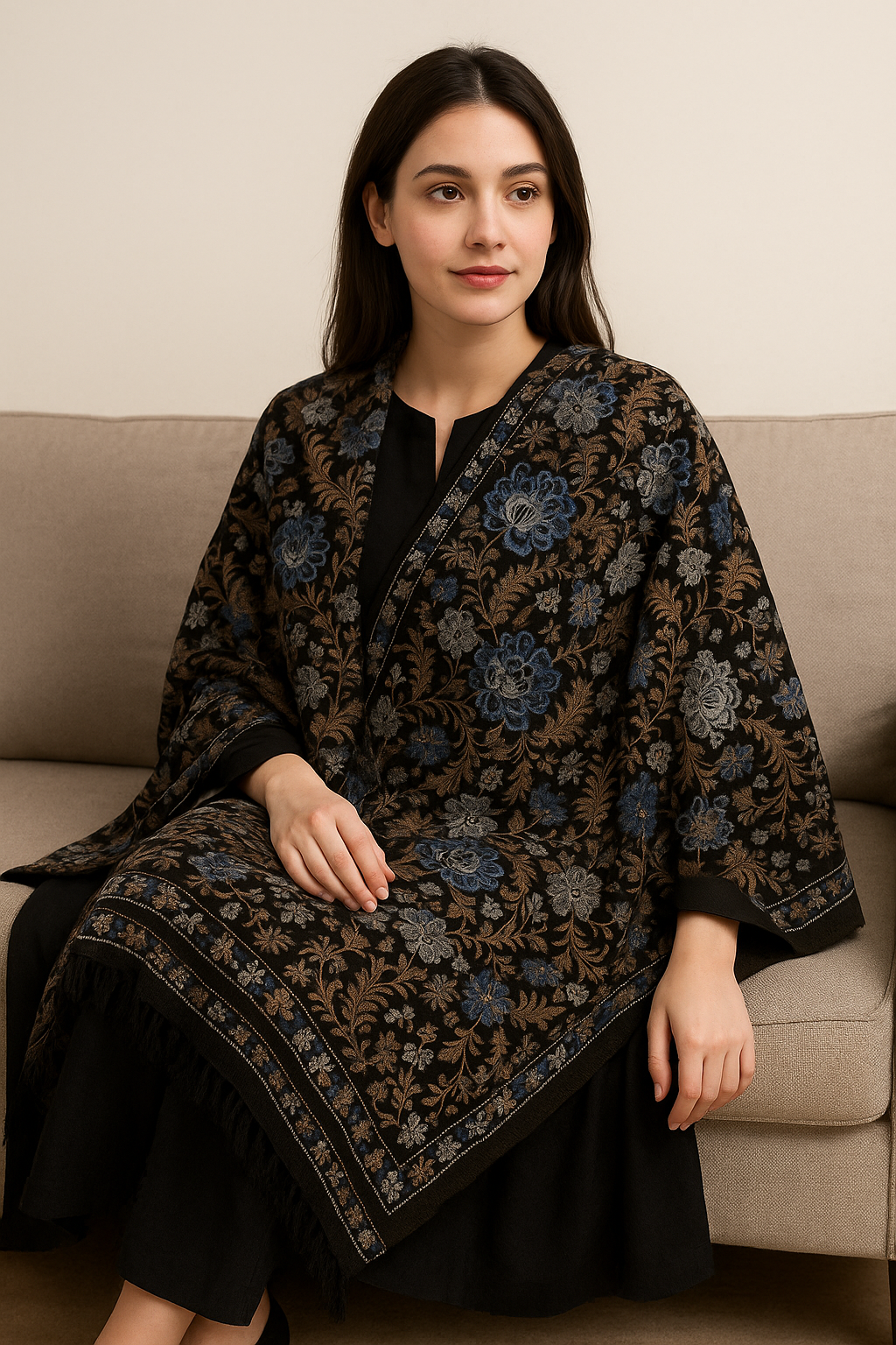 Luxury Karandi Embroidered Shawl – Black with Blue & Beige Aari Work