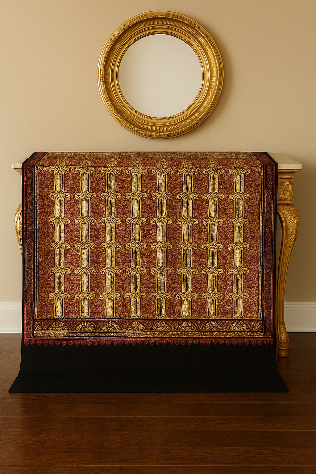 - Design: Repeated paisley-inspired motifs with ornate floral borders