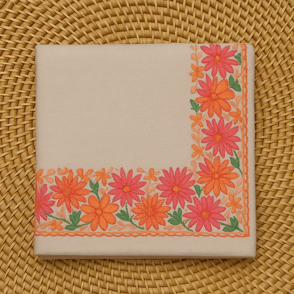 Wrap yourself in timeless elegance with this handcrafted pashmina shawl, featuring exquisite four-sided floral embroidery that adds a touch of sophistication to any outfit. The soft beige base beautifully complements the intricate threadwork in lively hues of pink, peach, and orange, creating a striking contrast that elevates both traditional and contemporary looks.