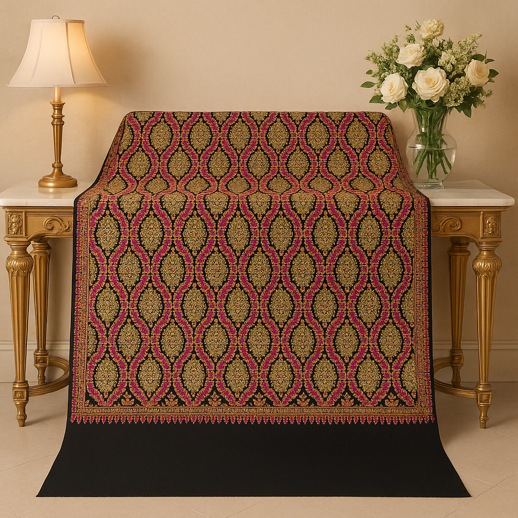 Luxury Pashmina Shawl – Golden & Pink Hand Embroidery on Black
