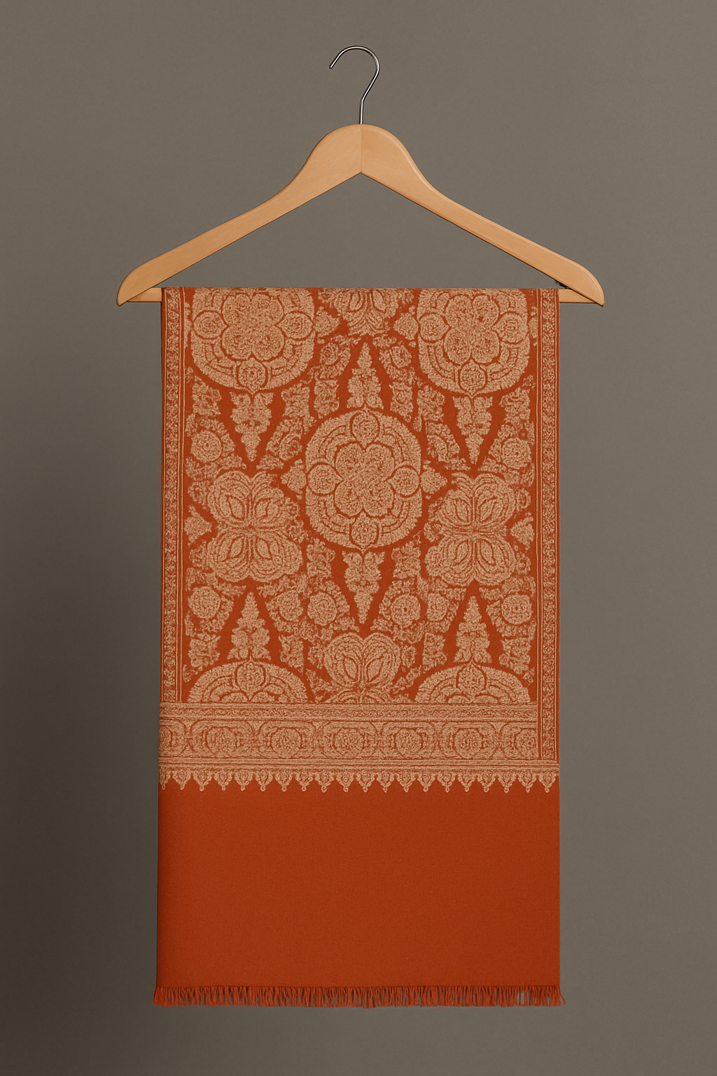 Elevate your wardrobe with this exquisite handcrafted Pashmina shawl, adorned with traditional Aari embroidery in timeless motifs. The rich burnt orange base paired with delicate beige threadwork showcases a heritage design that blends luxury with cultural elegance.