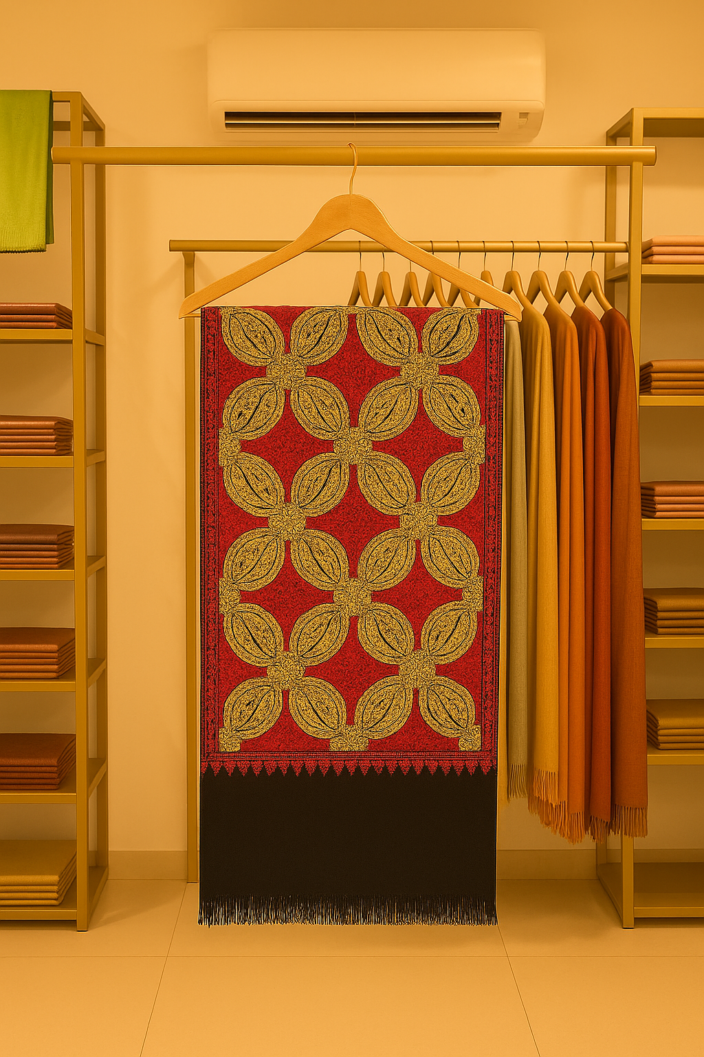 Elevate your winter wardrobe with this exquisite Pashmina Aari Embroidered Shawl, crafted to perfection for the modern woman who appreciates timeless elegance. Made from premium quality pashmina, this shawl features a rich crimson red base adorned with intricate golden aari embroidery in a floral lattice pattern — a true masterpiece of traditional craftsmanship.