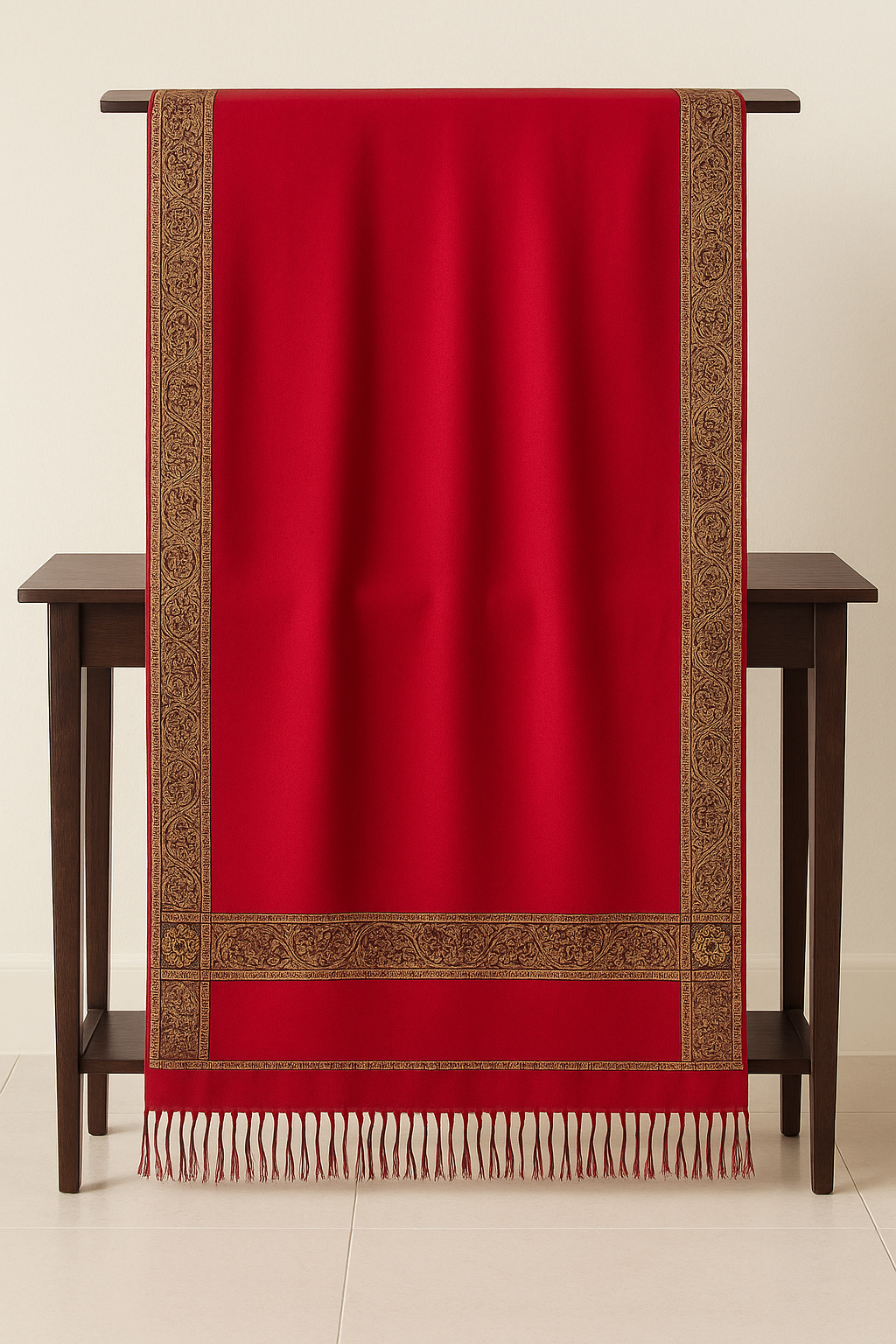Wrap yourself in luxury with our Premium Pashmina Jacquard Border Shawl. Crafted from fine pashmina, this shawl features a bold red base enhanced with beautifully woven golden jacquard floral and paisley borders. The classic design is completed with delicate fringes, making it ideal for both everyday elegance and festive occasions.