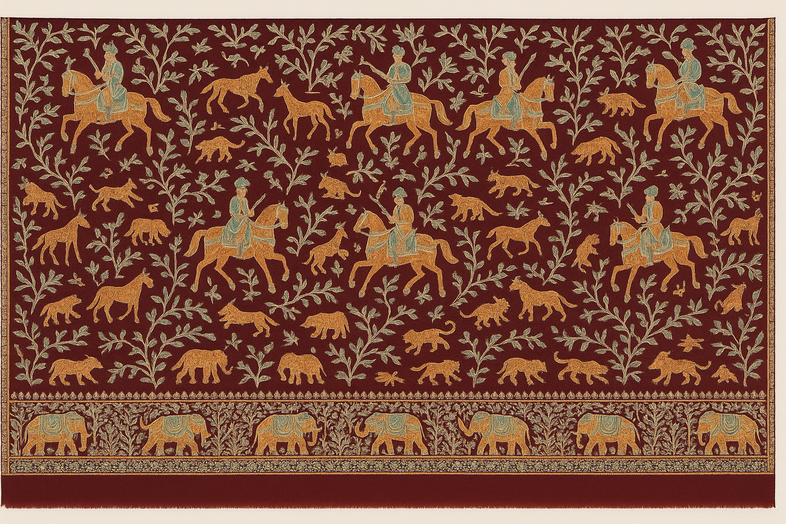 Elevate your winter wardrobe with this exquisite maroon pashmina shawl, featuring a richly detailed tapestry of royal hunt scenes. The intricate embroidery showcases horse-mounted hunters, majestic elephants, deer, and forest foliage—crafted in earthy tones of mustard, ivory, sage, and rust for a traditional yet timeless appeal.