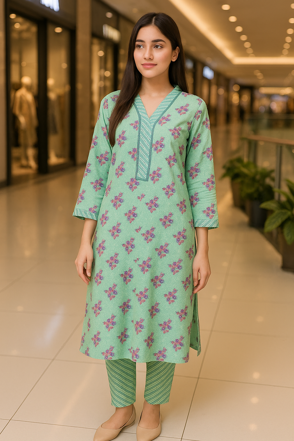 Elevate your everyday style with this mint green cotton 2-piece suit, crafted for comfort and elegance. The kurta features a delicate floral print in soft purple tones, paired with a subtle geometric design on the neckline and trousers for a chic contrast. Made from breathable cotton, this outfit is perfect for casual outings, workdays, or summer gatherings.