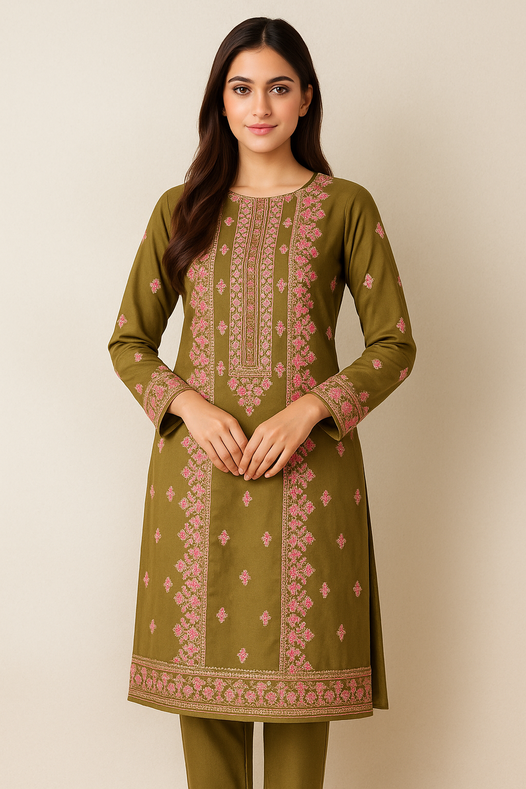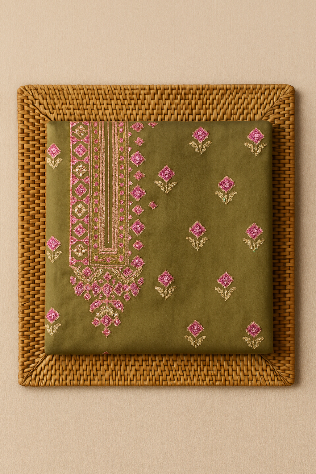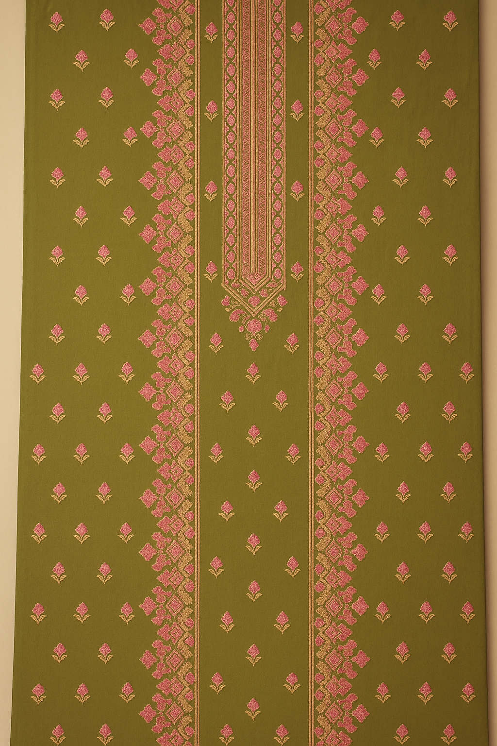 Elevate your summer wardrobe with this elegant 2-piece unstitched lawn suit, featuring a timeless design in an earthy olive green base. Crafted from premium quality lawn fabric, the shirt boasts intricate pink thread embroidery along the neckline, front panel, sleeves, and hemline. adding a delicate contrast and refined charm.