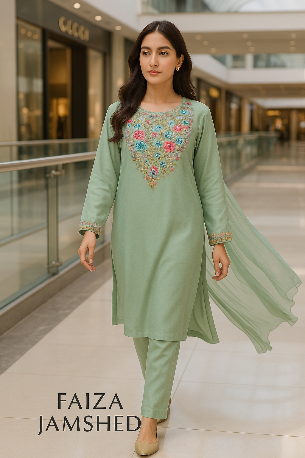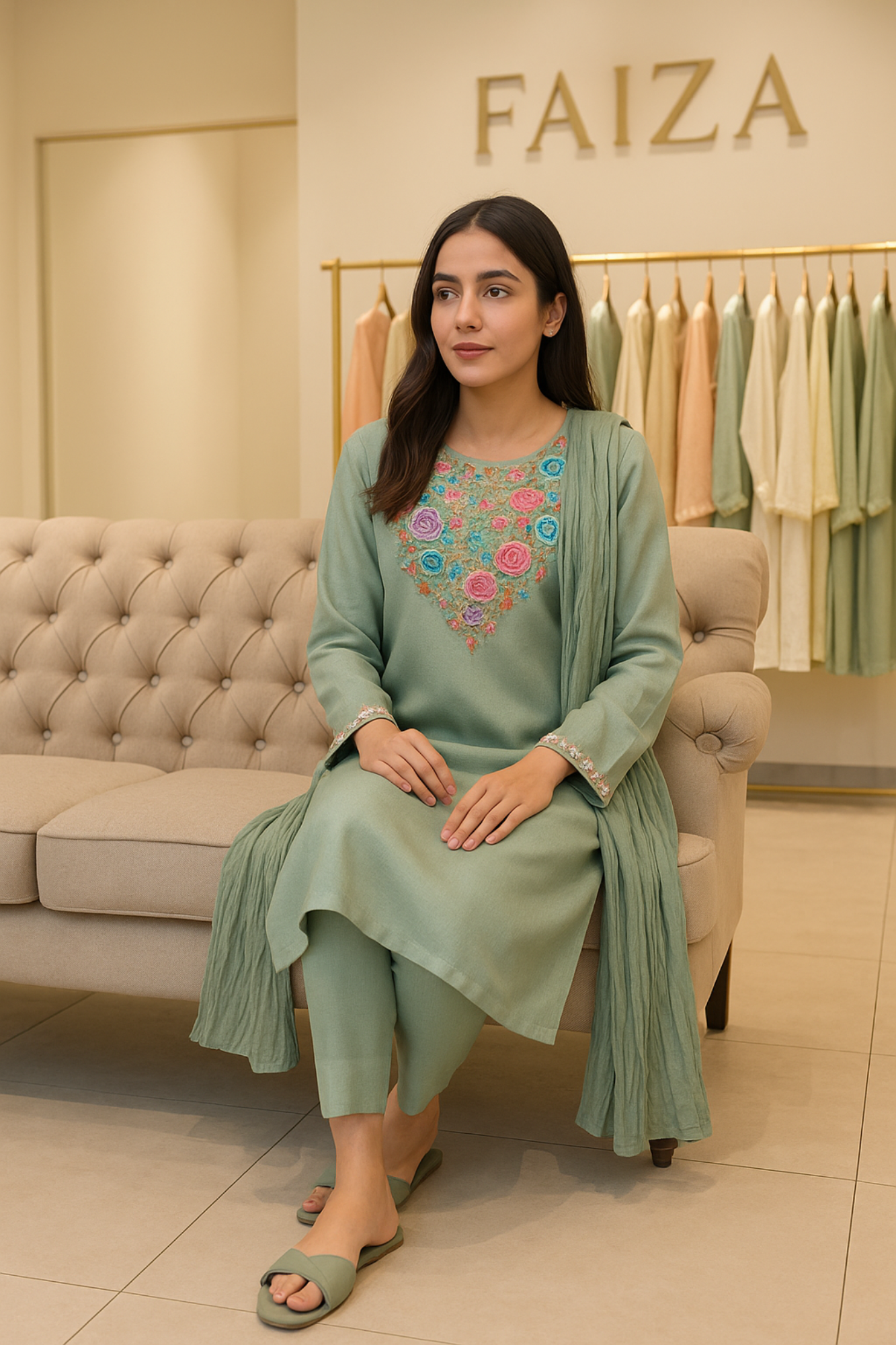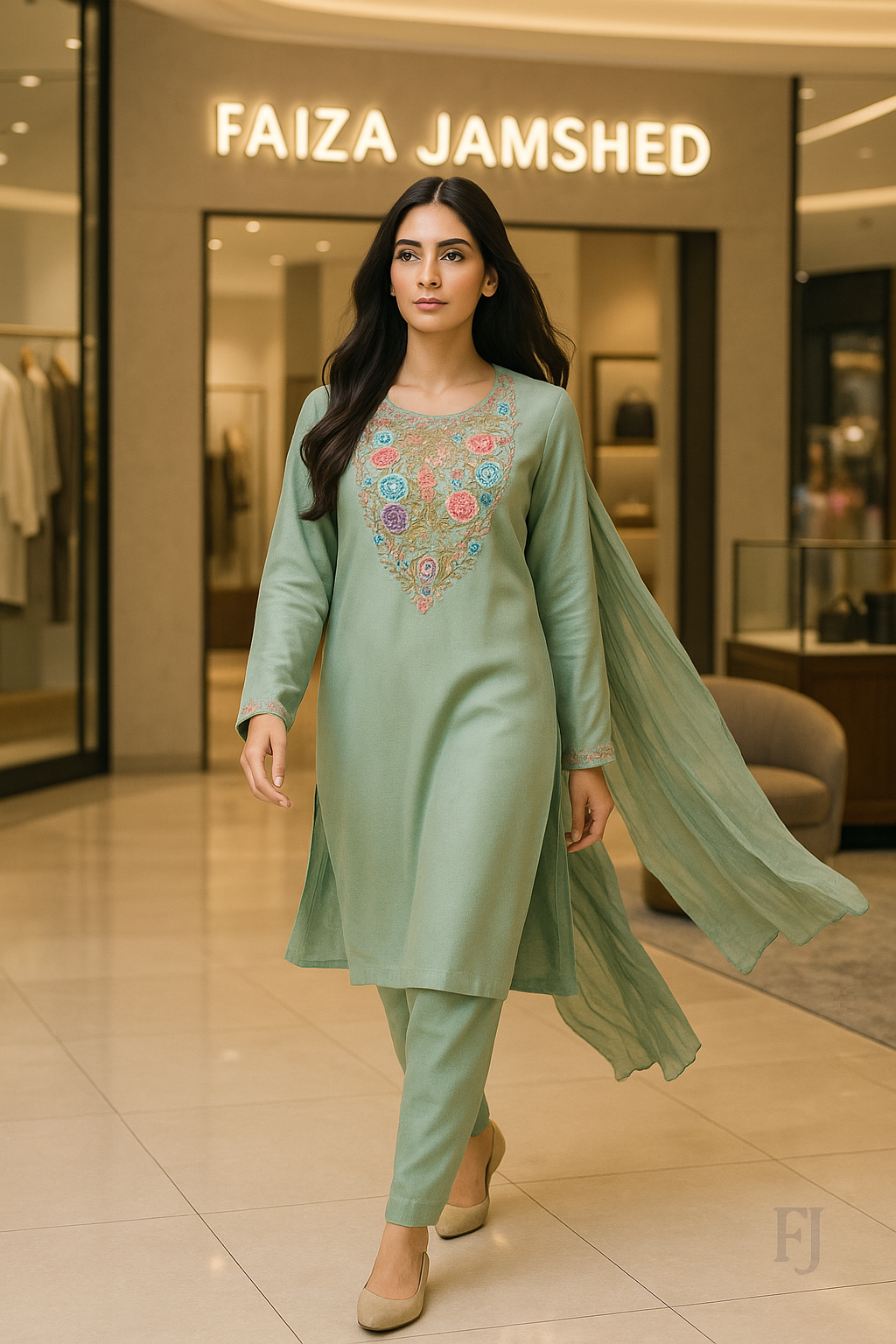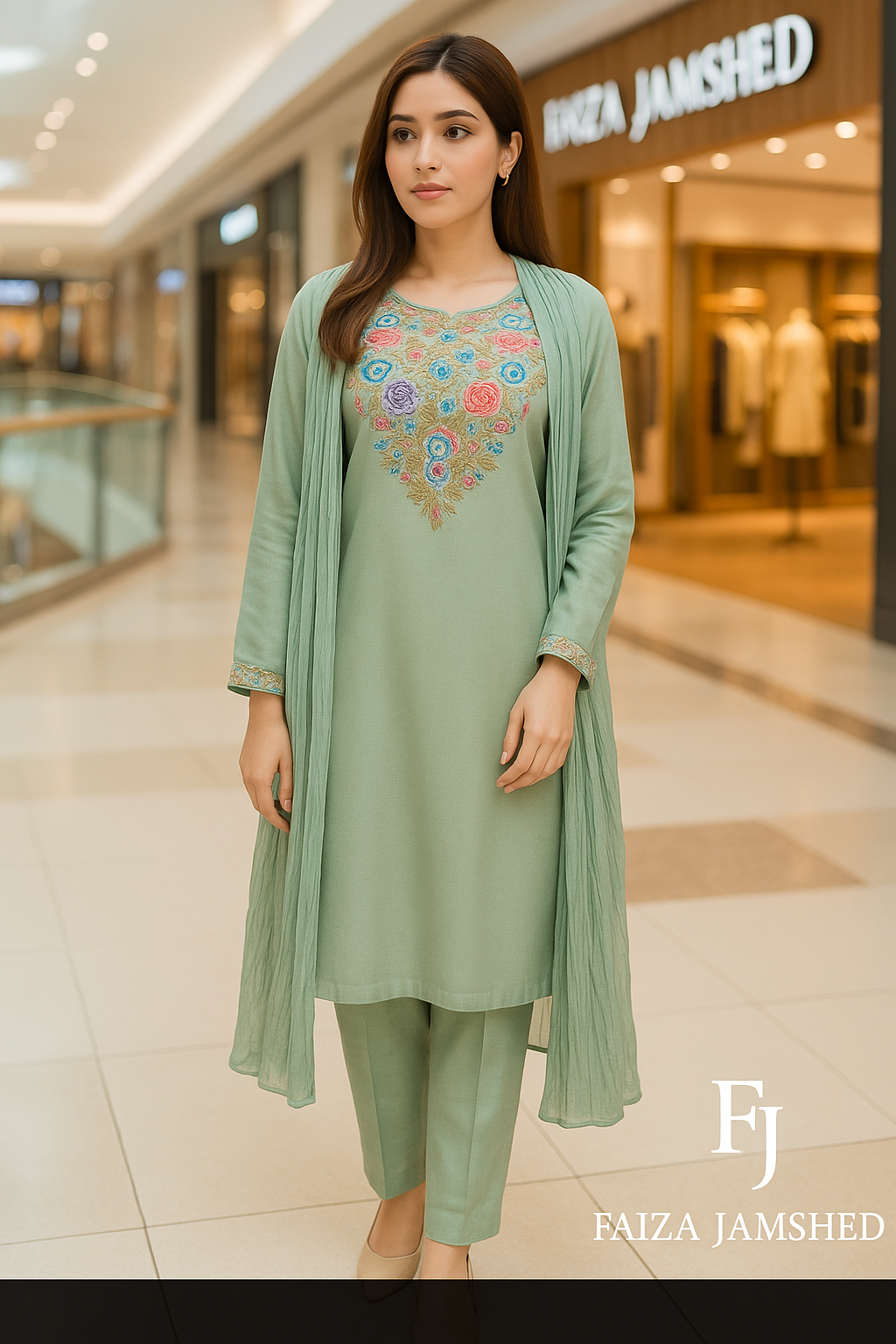 Grace meets heritage in this elegant pastel sage 3-piece suit from Faiza Jamshed, designed for the woman who values timeless craftsmanship and effortless style. With delicate machine embroidery and a traditional chunri accent, this ensemble offers a refined statement for summer soirées or casual luxury.