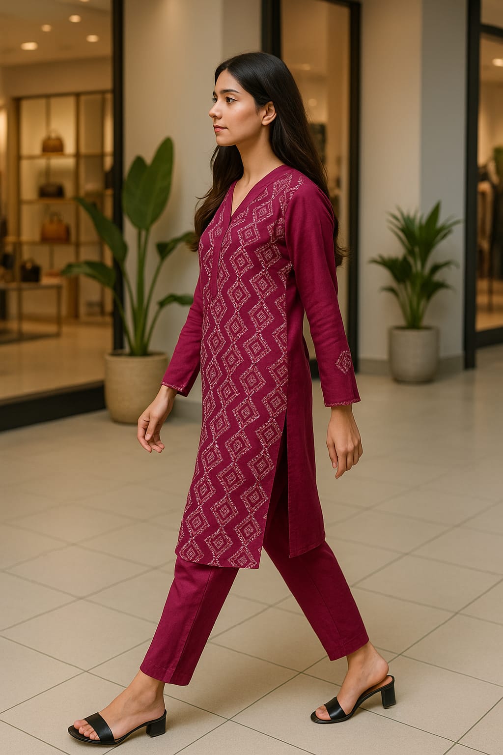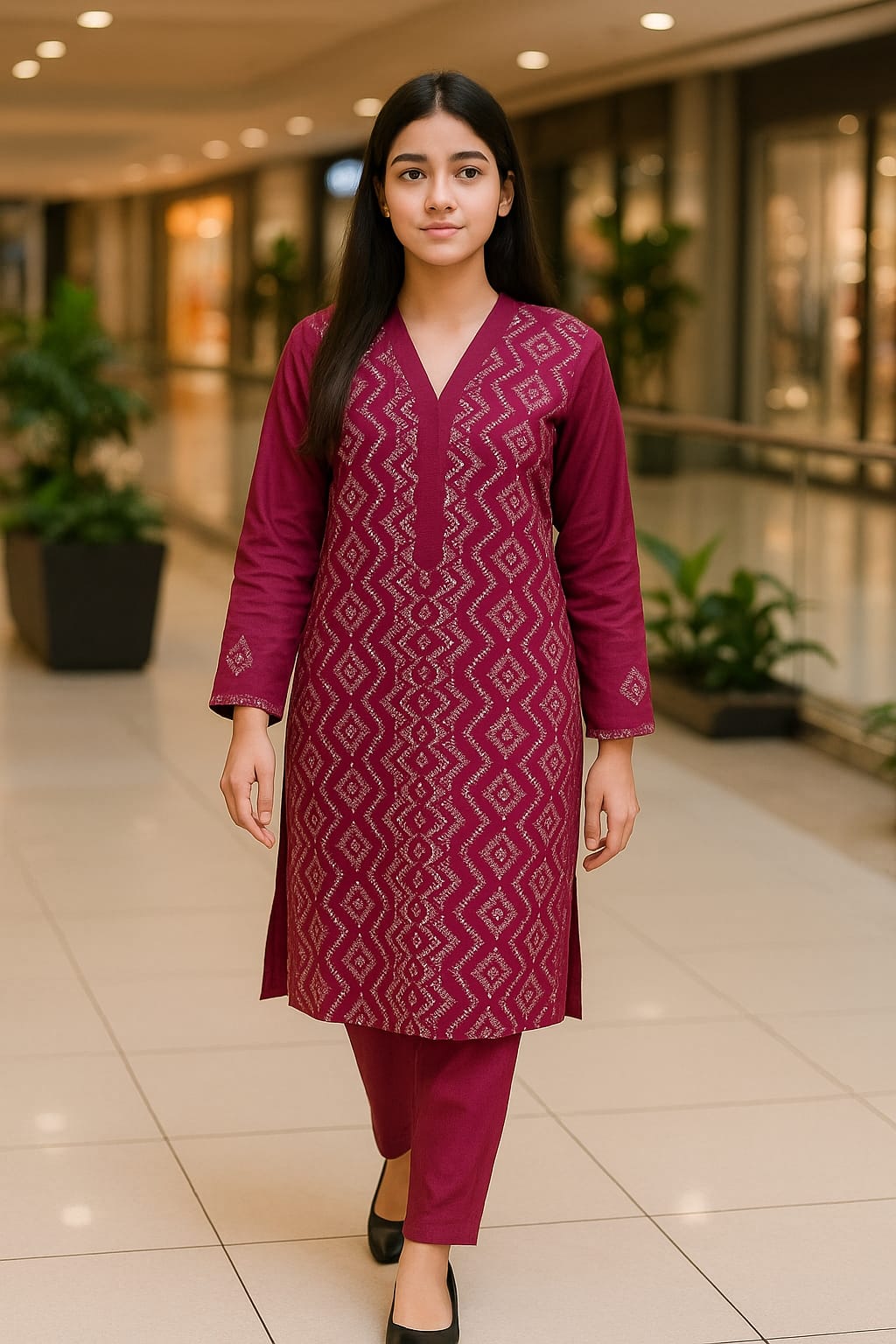 Step into elegance with this sophisticated 2-piece maroon lawn outfit, perfect for casual and semi-formal wear. Crafted from soft, breathable lawn fabric, this ensemble features a medium-length straight shirt adorned with geometric-inspired embroidery in contrasting white thread. The intricate embroidery runs gracefully along the center panel, adding texture and visual depth to the rich maroon base.