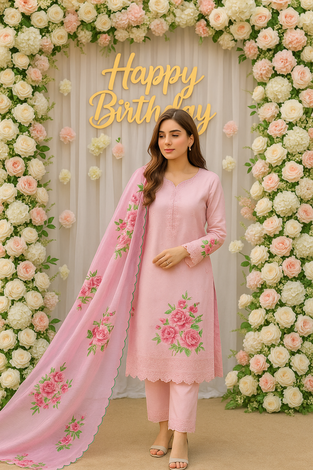 Elevate your festive wardrobe with this blush pink cotton net dupatta, beautifully crafted with intricate floral machine embroidery in vibrant rose motifs. Finished with a delicate scalloped edge in green, this dupatta adds a soft, feminine charm to any ensemble. Lightweight and graceful, it’s perfect for birthdays, festive gatherings, and elegant daytime occasions.