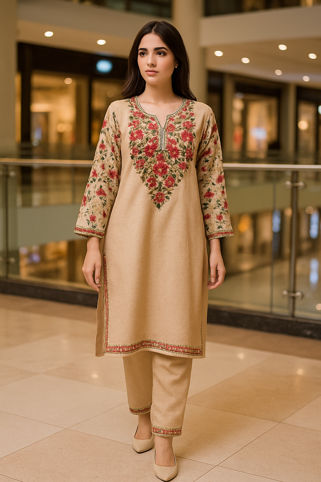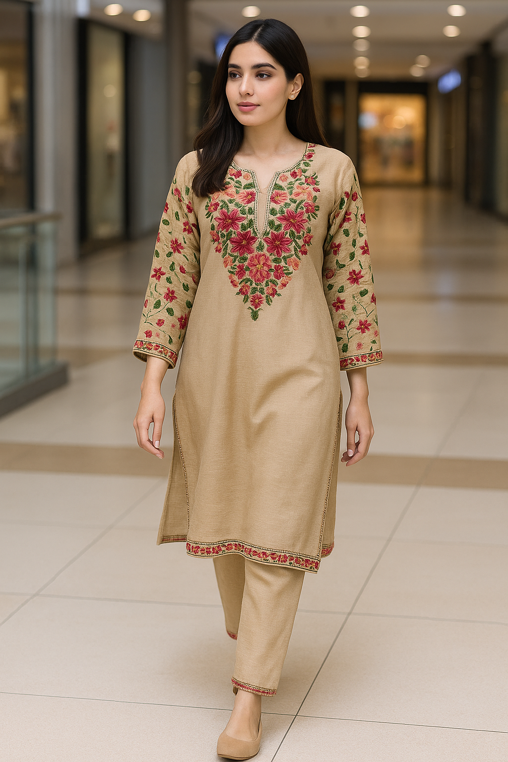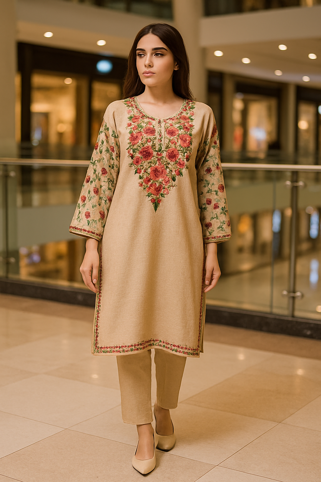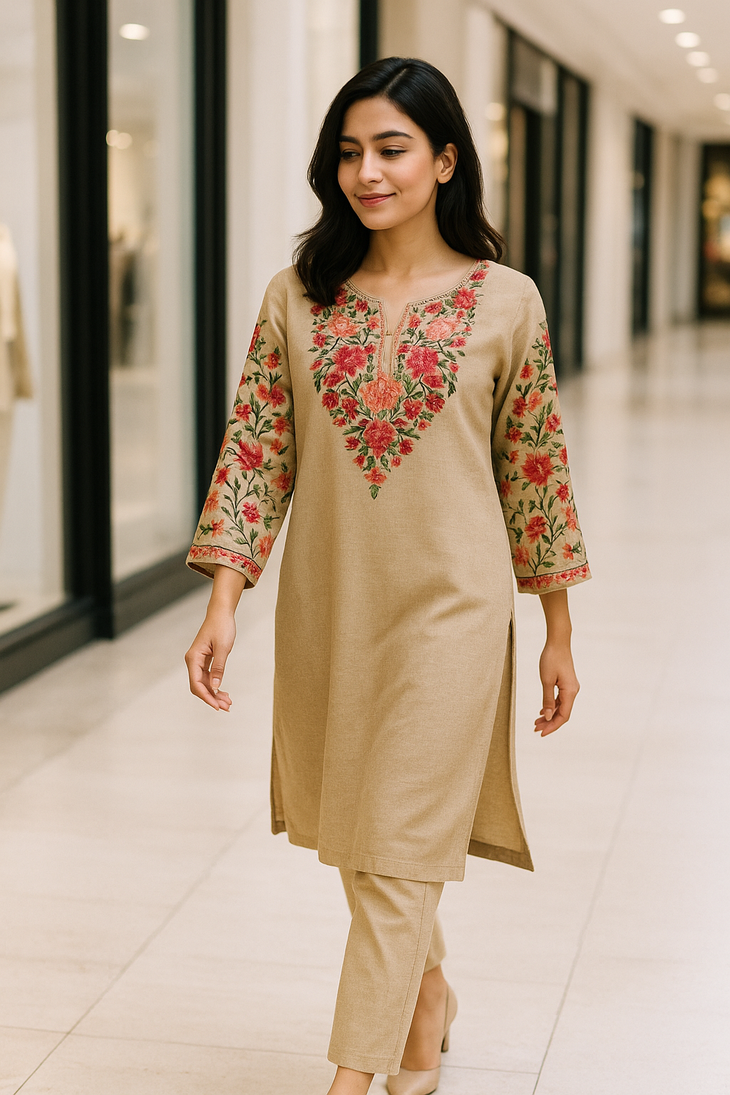 Elevate your everyday elegance with this exquisite sand beige Pashmina kurta, adorned with timeless Kashmiri Aari embroidery. Meticulously handworked, this kurta features a stunning floral pattern in rich hues of crimson, coral, and forest green, beautifully cascading from the neckline in a traditional V-split design. The embroidery continues along the full-length sleeves, creating a harmonious balance of heritage and grace.