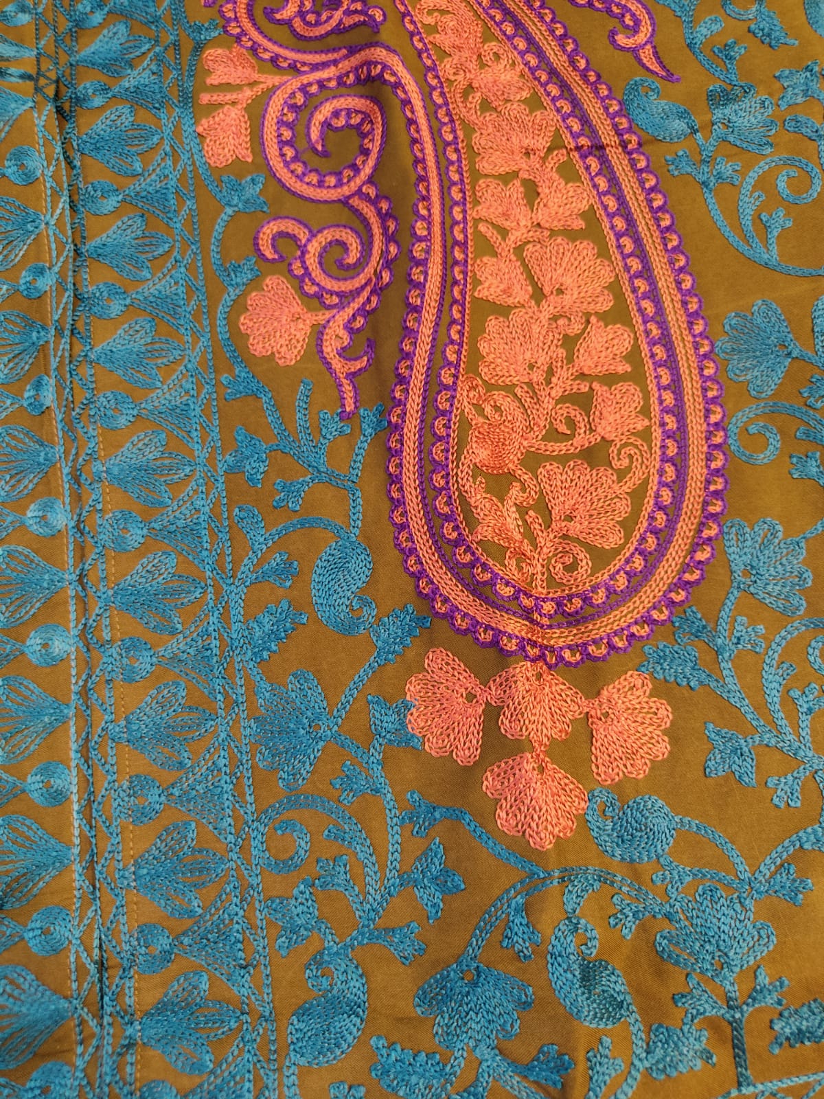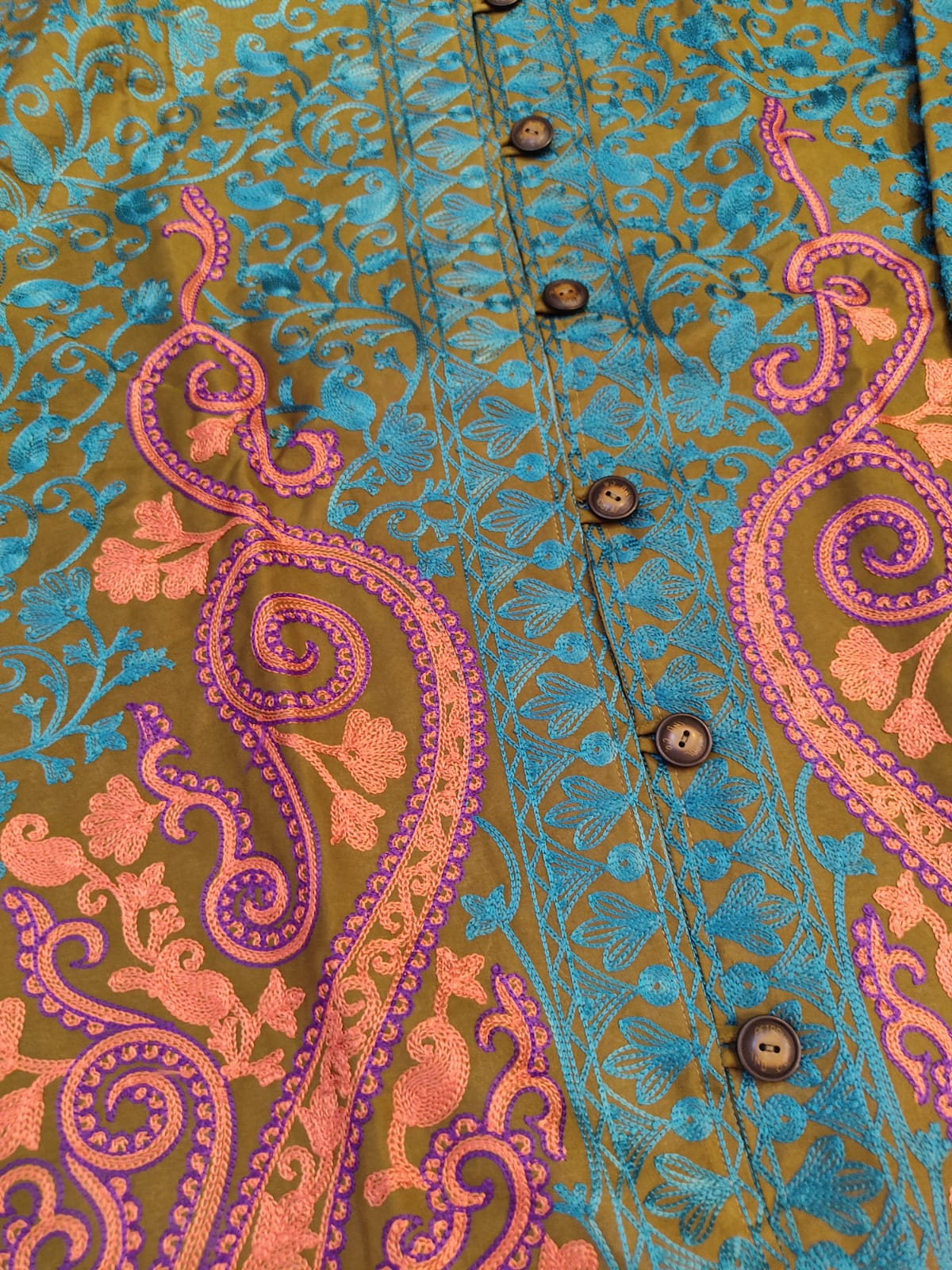 Elevate your wardrobe with a piece of timeless artistry. This stunning jacket is a testament to the exquisite and intricate embroidery traditions of Kashmir. Perfect for adding a touch of bohemian elegance and vibrant color to any outfit.