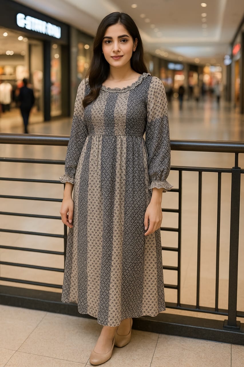 "Soft elegance meets vintage charm . This chiffon maxi blends delicate patterns with a flattering silhouette, perfect for a graceful stroll or a cozy café moment. Lightweight, flowy, and effortlessly stylish."